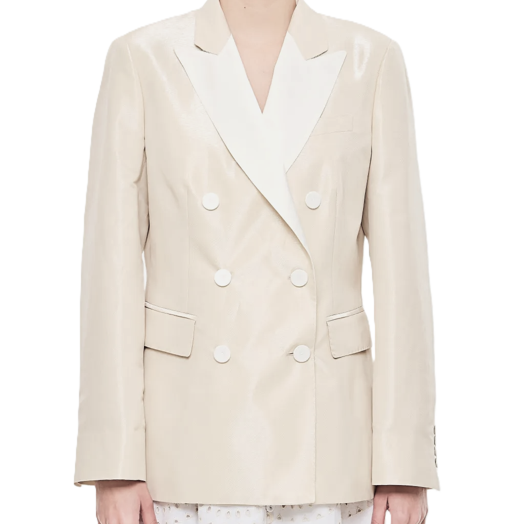 Blazer vendibile solo abbinato al pantalone, colore bianco, chiusura frontale con abbottonatura, maniche lunghe, due tasche laterali con patta, polsini con abbottonatura