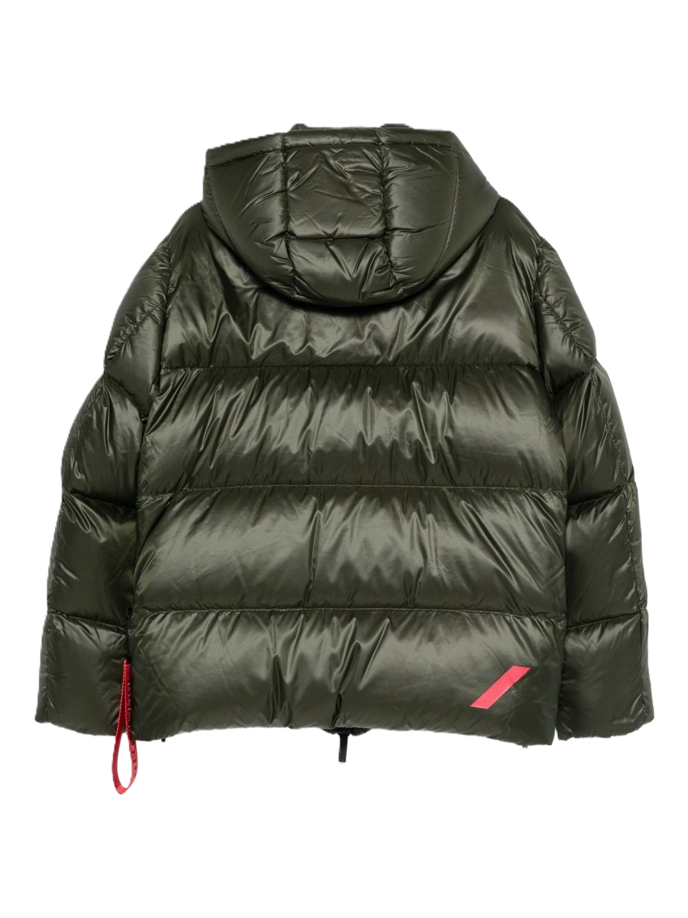 Cappuccio con coulisse regolabile, chiusura frontale e tasche a filetto con zip, patch con logo sulla manica sinistra, pendaglio rosso logato.