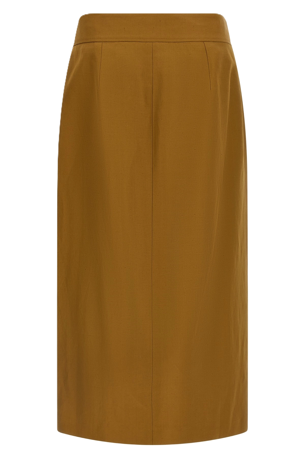 Gonna midi in misto viscosa e lino, modello a portafoglio con chiusura asimmetrica a gancio frontale.