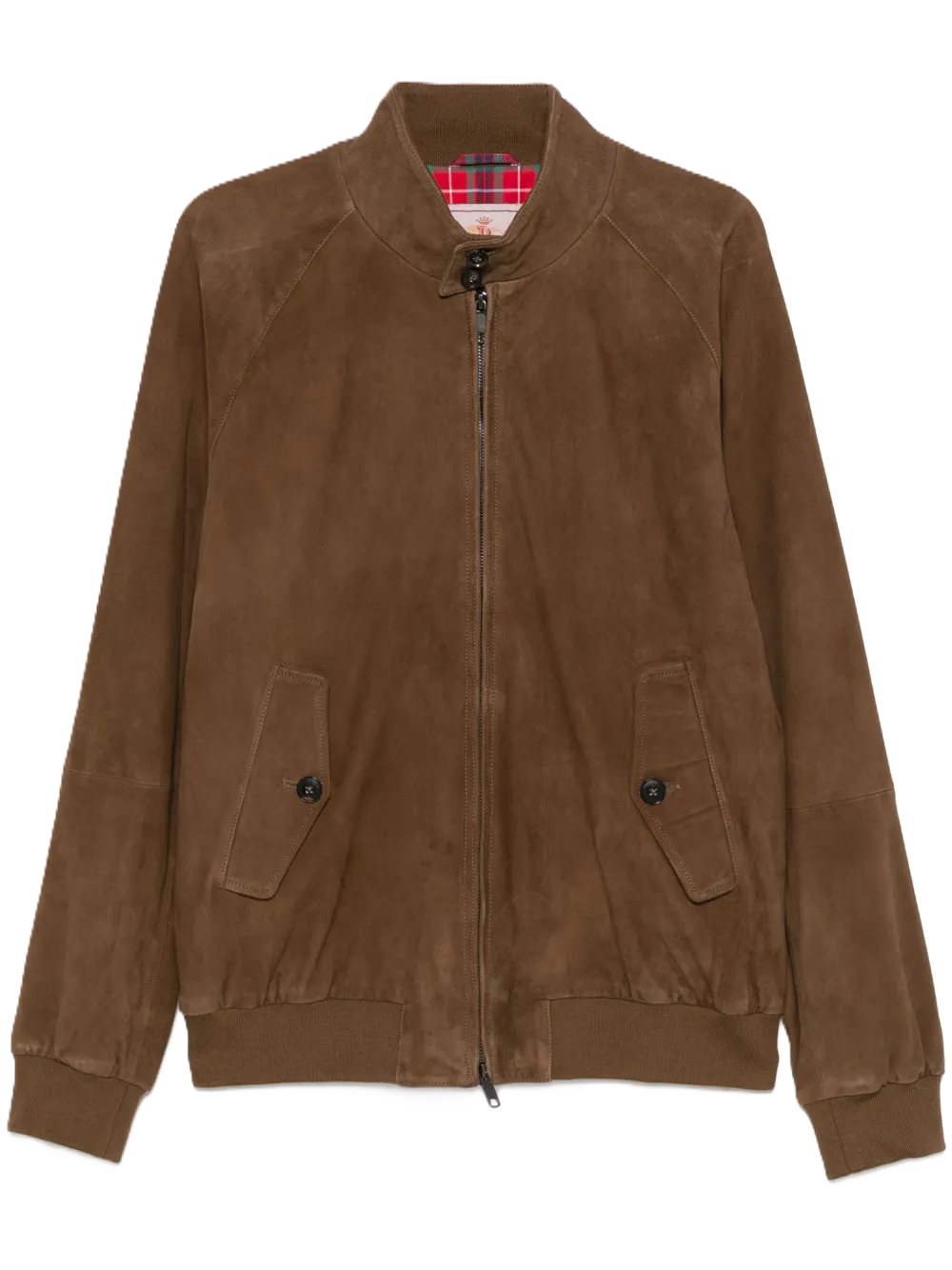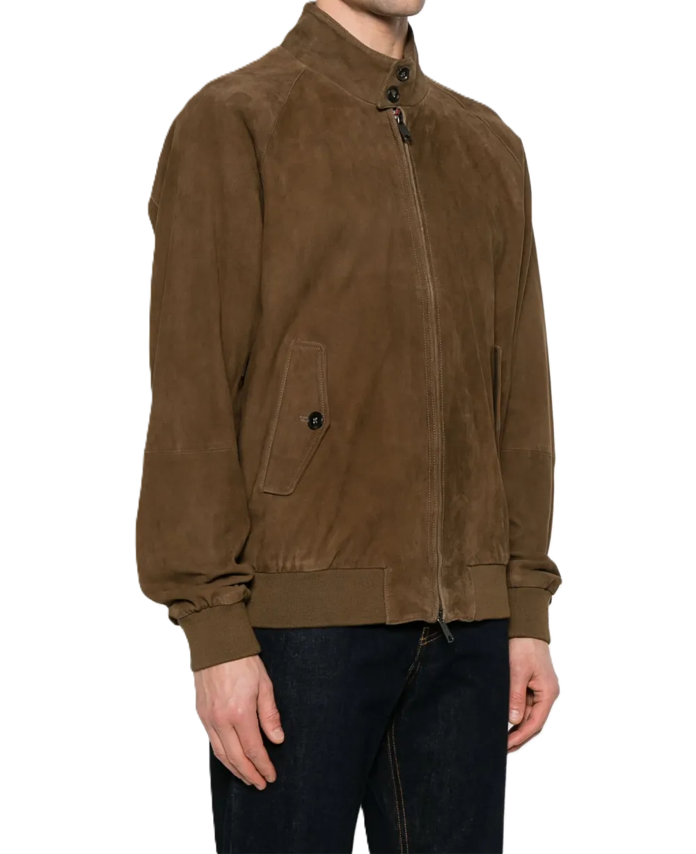 Giacca in pelle scamosciata con pannelli G9 Harrington color oliva scuro, chiusura frontale con cerniera bidirezionale, colletto rialzato, polsini e orlo a coste, due tasche laterali con patta, fodera in cotone
