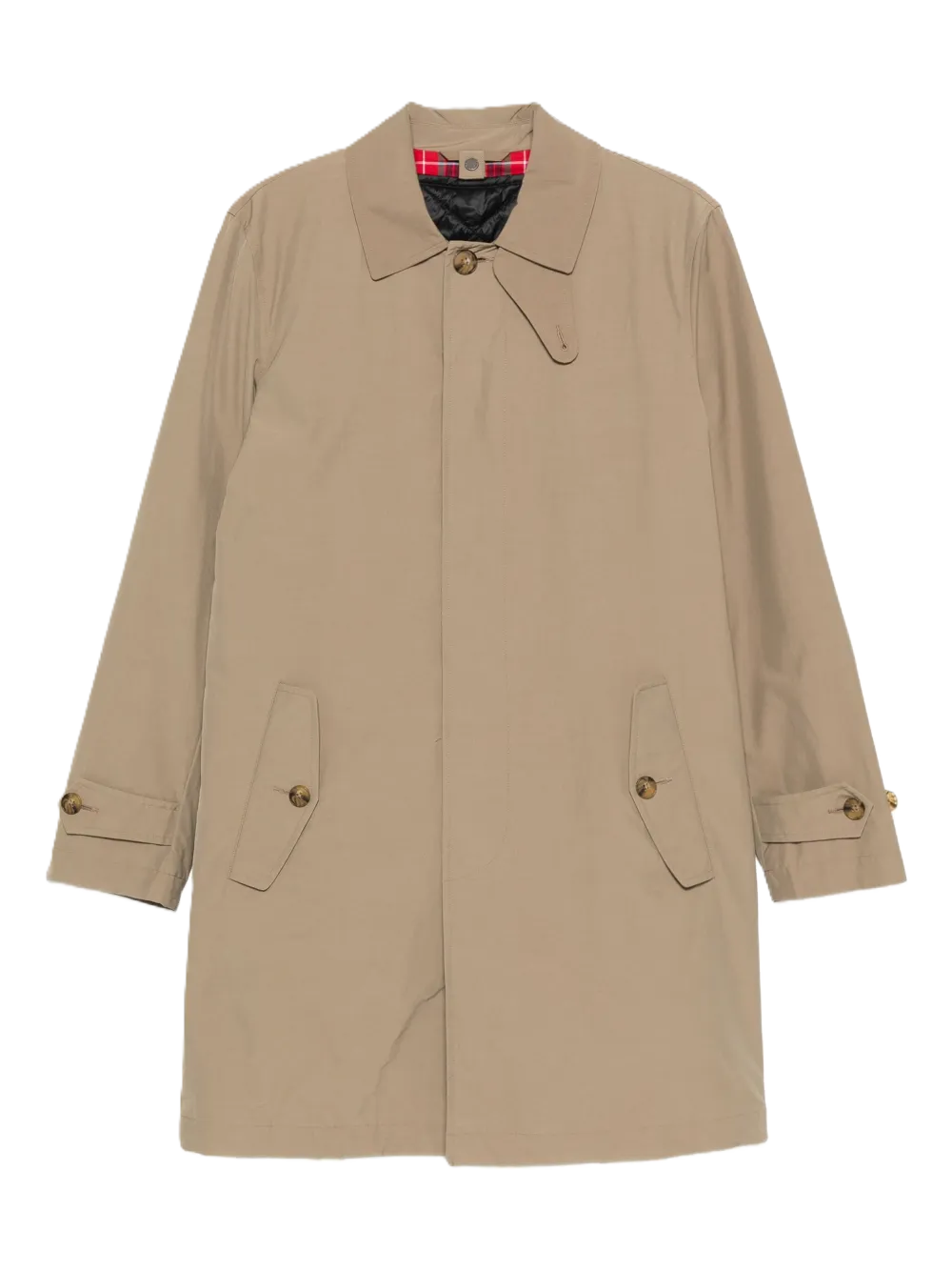 trench con tasche a patta e chiusura a bottoni beige, collo con collare, colletto interno in tartan, maniche lunghe