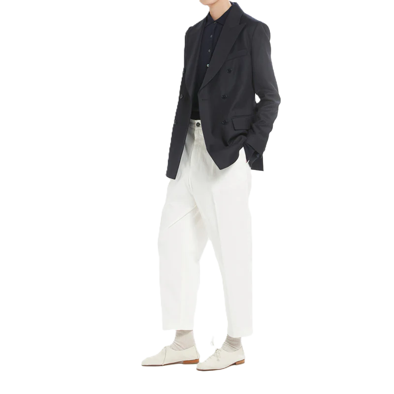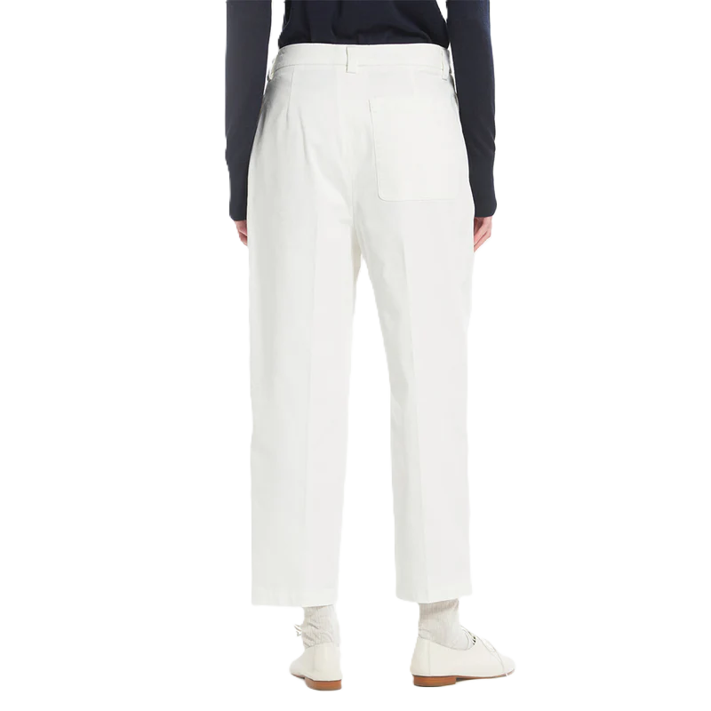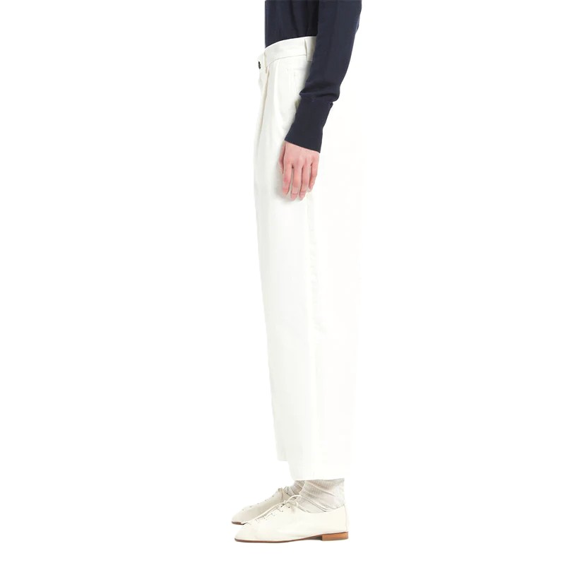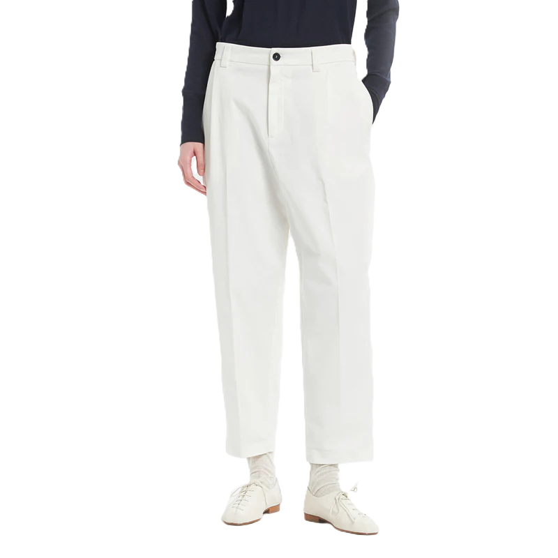 Pantalone dalla silhouette rilassata, vita media, taglio classico. Due tasche verticali, una tasca applicata sul retro. Doppia piega con passanti per cintura. Chiusura con cerniera e bottone