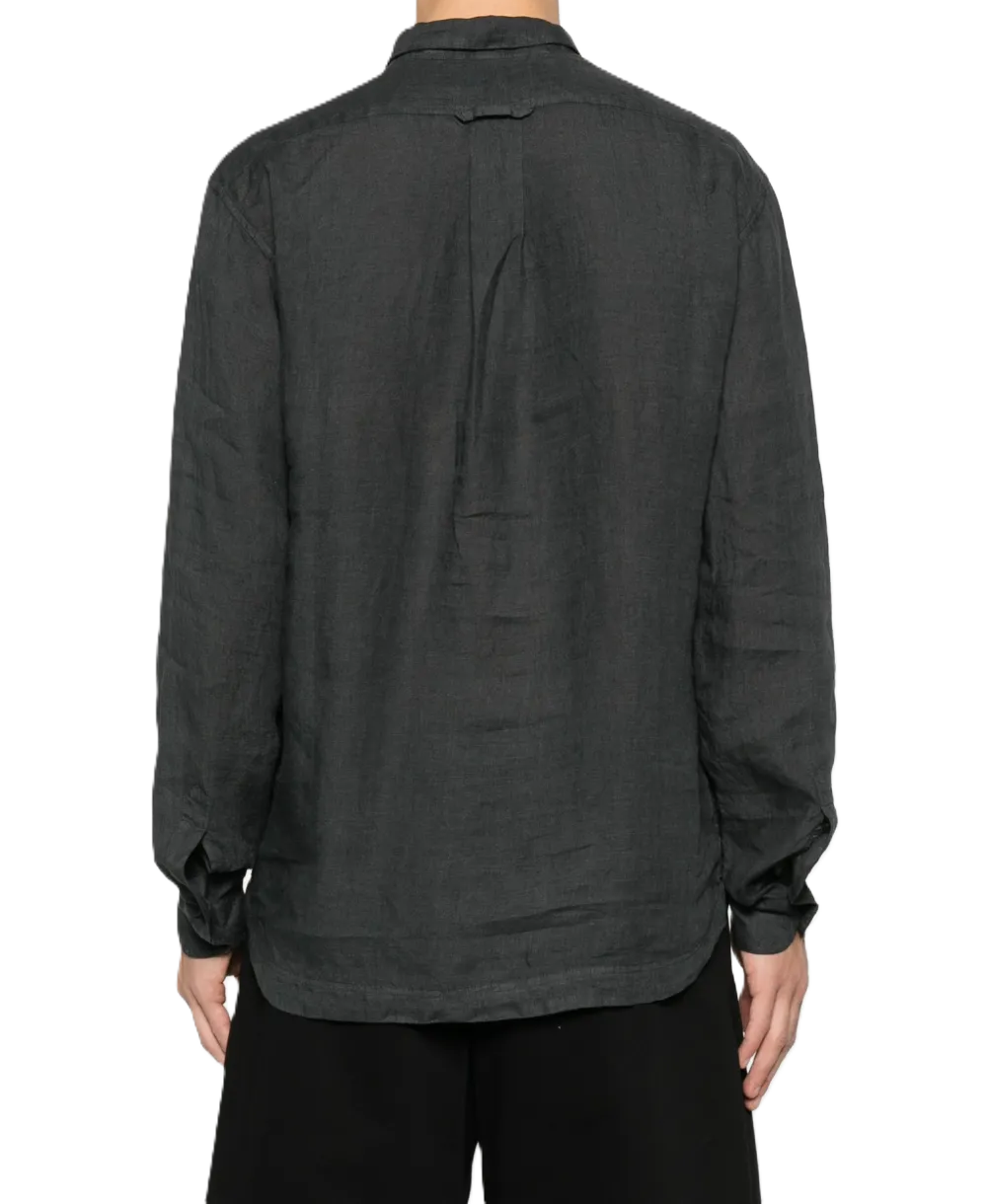 Camicia di lino color grigio, chiusura a mezzo bottone, maniche lunghe, colletto classico, polsini abbottonati
