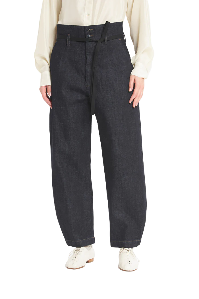Pantaloni a vita alta con tasche oblique sul davanti e tasche a filetto con bottone sul retro. Inclusa una coulisse in cotone. Fit comodo, rifinito con cuciture a contrasto color marrone.