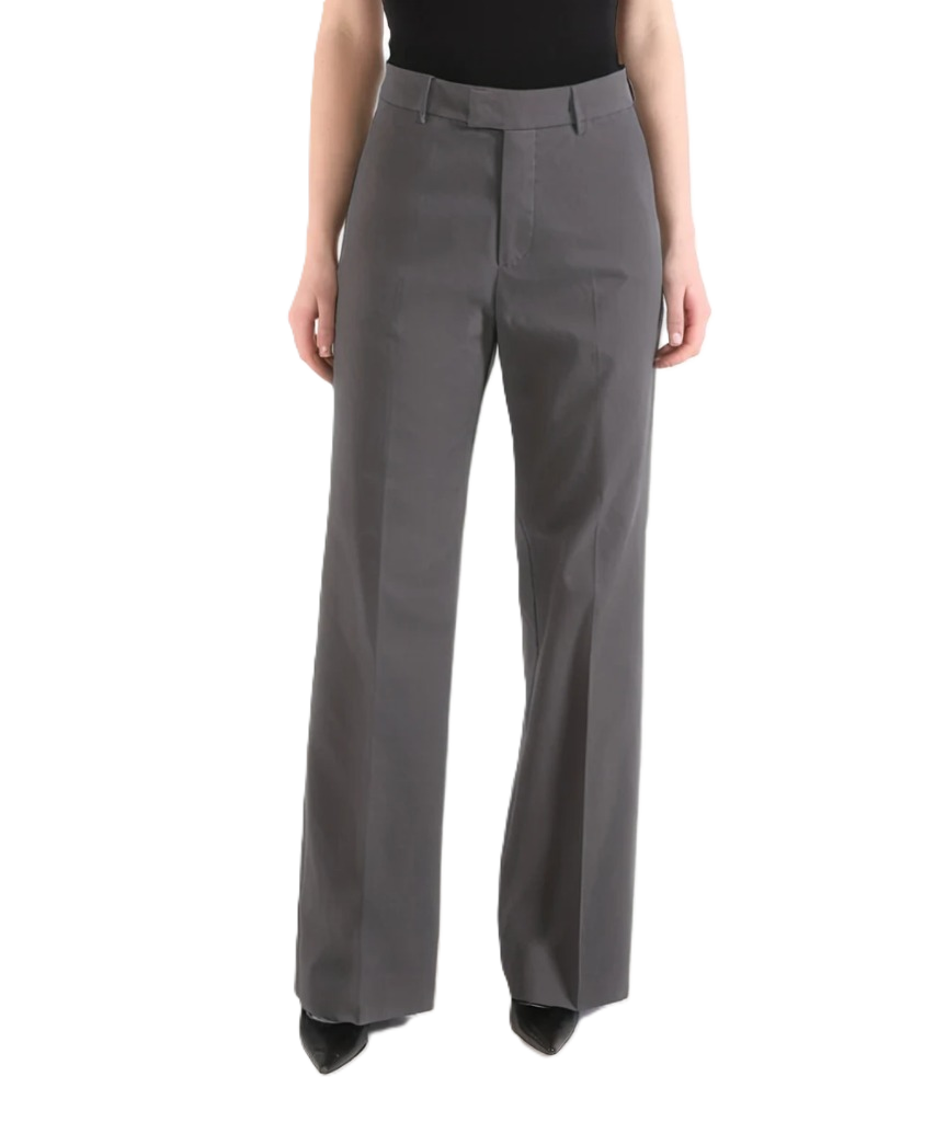 Pantalone dritto con zip e gancio nascosto, tasche laterali funzionali e tasche finte sul retro.
