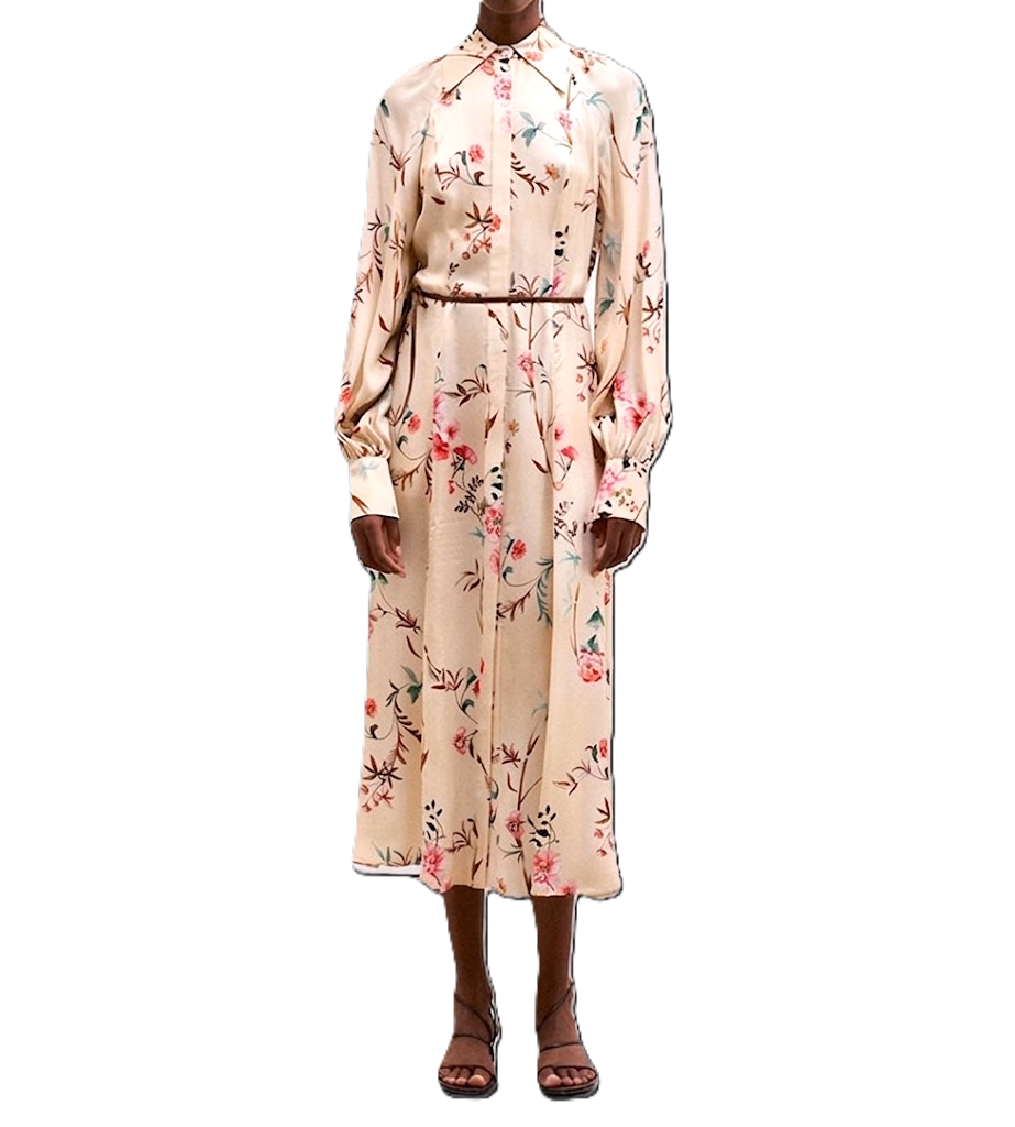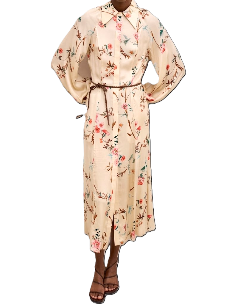 Abito chemisier midi in viscosa stampata, dalla linea fluida e femminile. Il collo a camicia e le maniche lunghe definiscono la struttura del capo, mentre la cintura sottile in vita e le tasche laterali aggiungono funzionalità ed equilibrio. Un modello elegante e versatile, pensato per accompagnare con leggerezza le diverse occasioni della giornata.