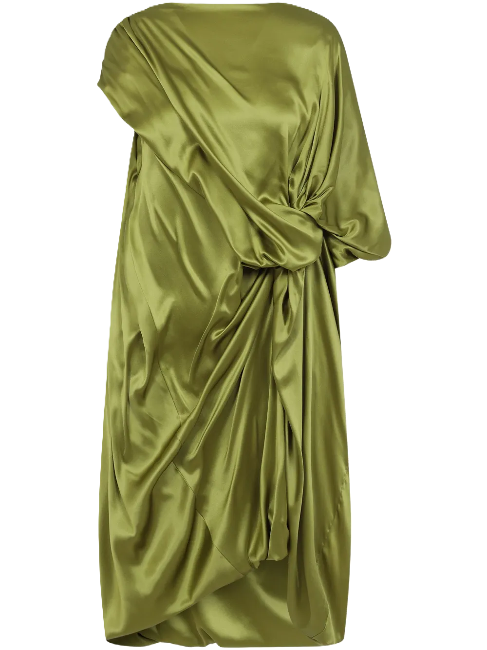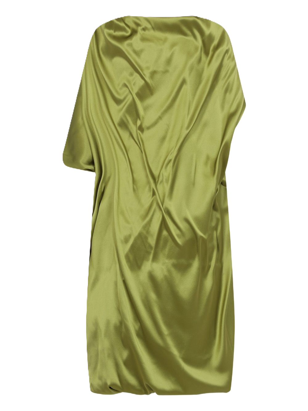 Vestito dal design asimmetrico verde oliva, drappeggiato con dettaglio monospalla.