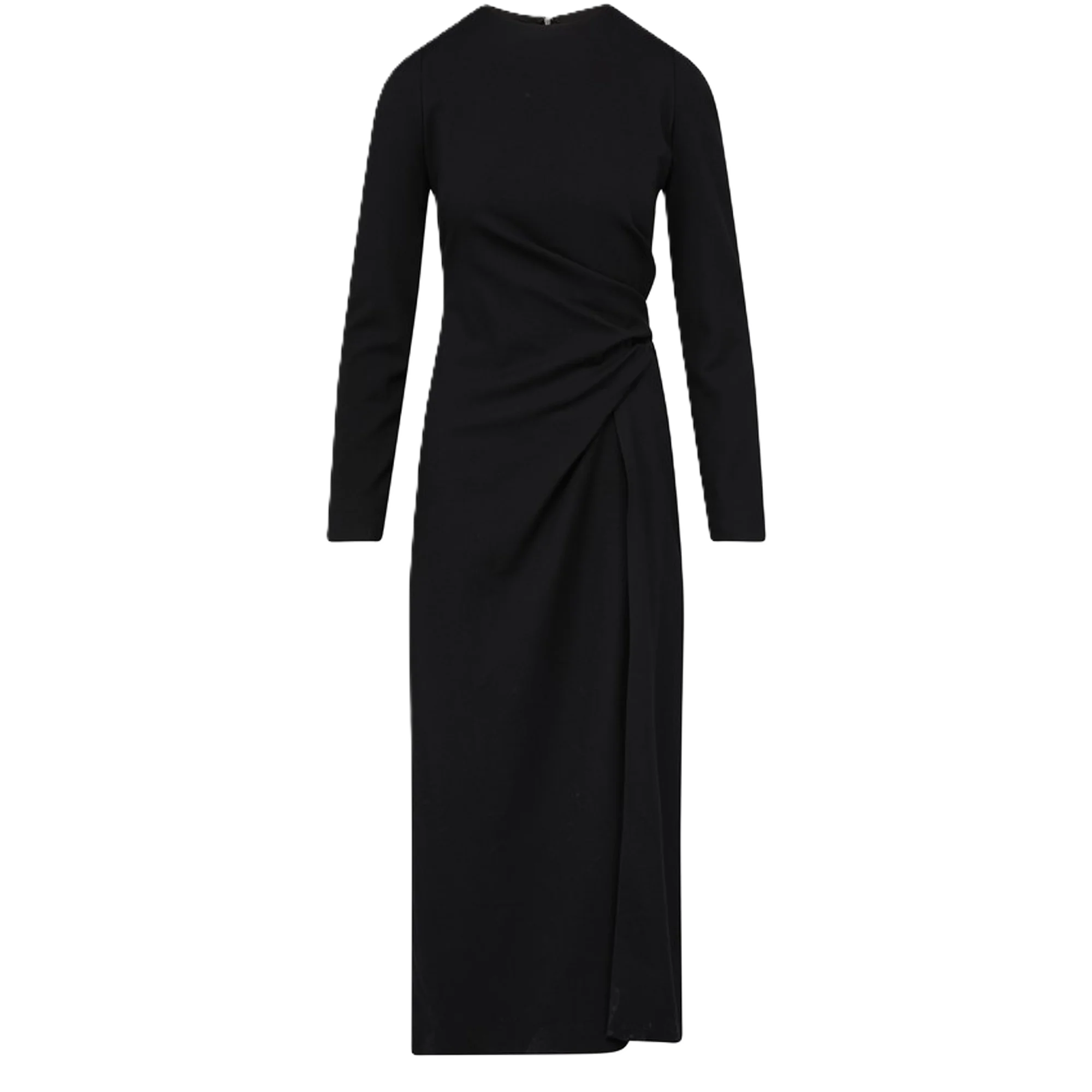 Abito midi nero a maniche lunghe, dettaglio drappeggiato sul fianco che regala una consistenza asimmetrica con una semplicità elegante.