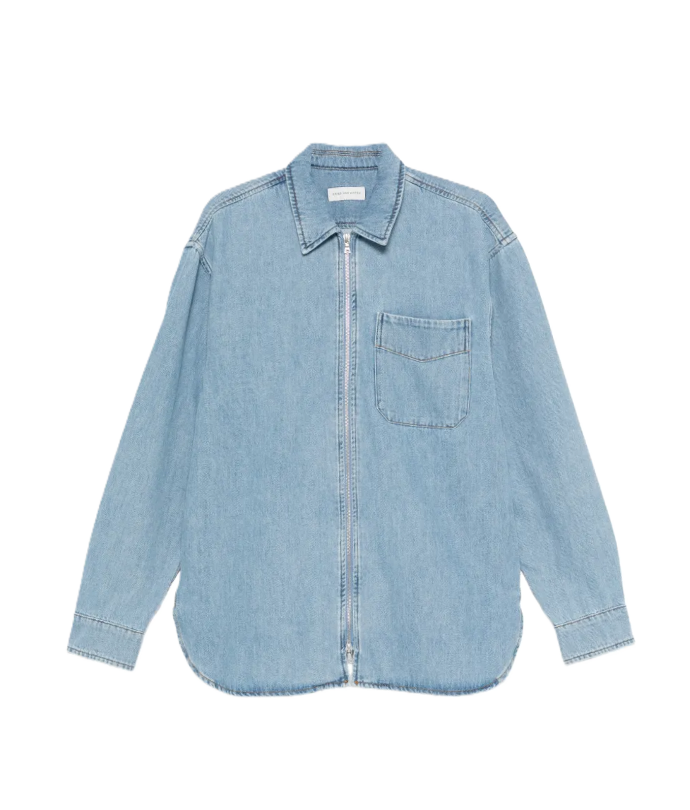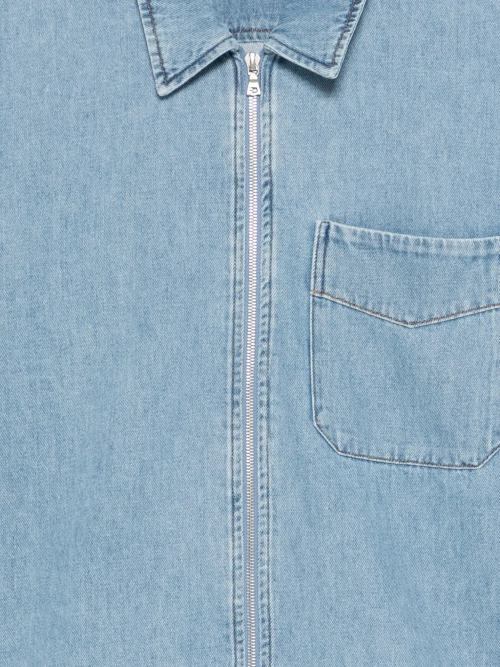 Camicia in denim chiaro, tasca sul petto, chiusura con cerniera, polsini con bottoni, orlo curvo