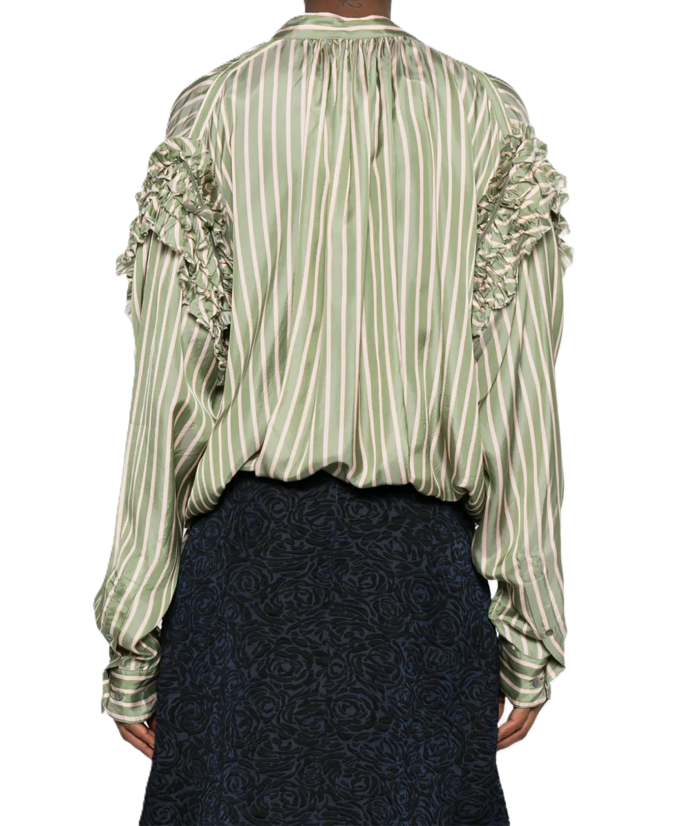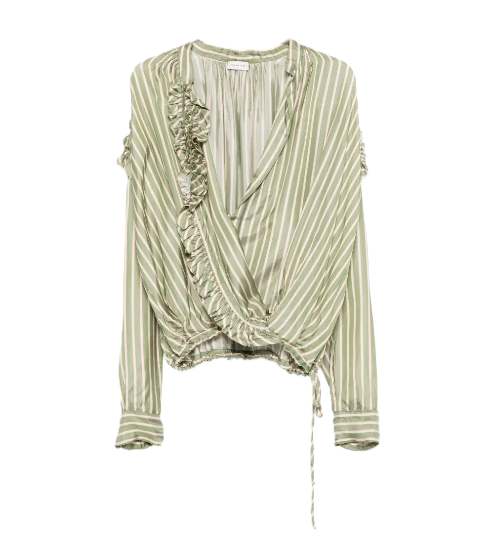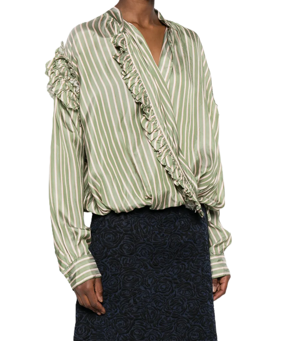blusa camicia a righe verdi/rosa con volant, scollo a V incrociato e laccetto, maniche lunghe.