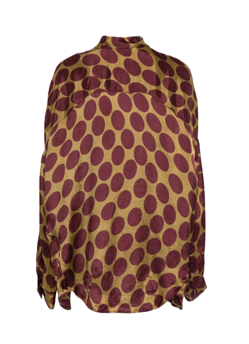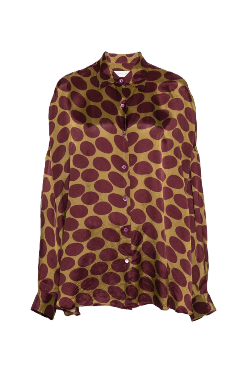 Questa camicia di Dries Van Noten è caratterizzata dalla stampa all-over "Soft Ellipses", che aggiunge una nota artistica e grafica al design. Realizzata in twill di viscosa fluida, presenta un taglio aderente e maniche lunghe per una silhouette definita. La chiusura frontale con bottoni nascosti pulisce ulteriormente l'estetica del capo, rendendolo ideale per chi cerca un look ricercato e contemporaneo.