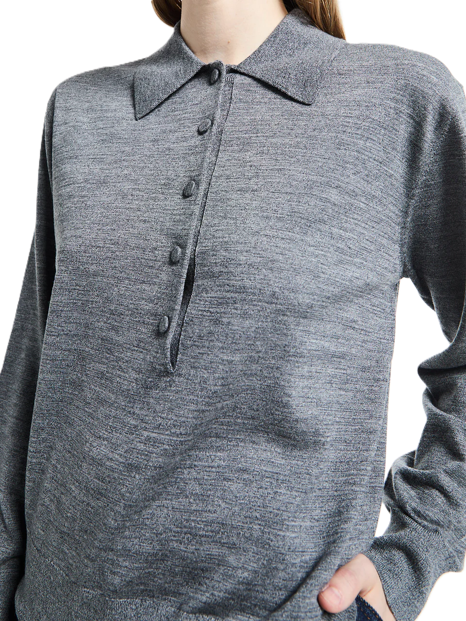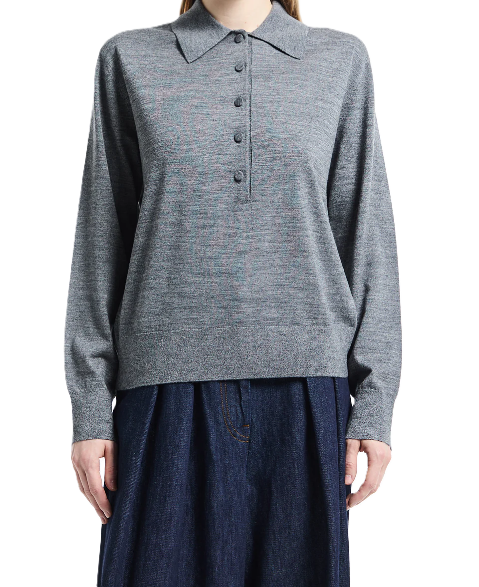 La polo Tuno in grigio è realizzata in maglia di lana merino e presenta maniche lunghe, un colletto tradizionale e una patta abbottonata sul petto, che la rendono un modello elegante e senza tempo.