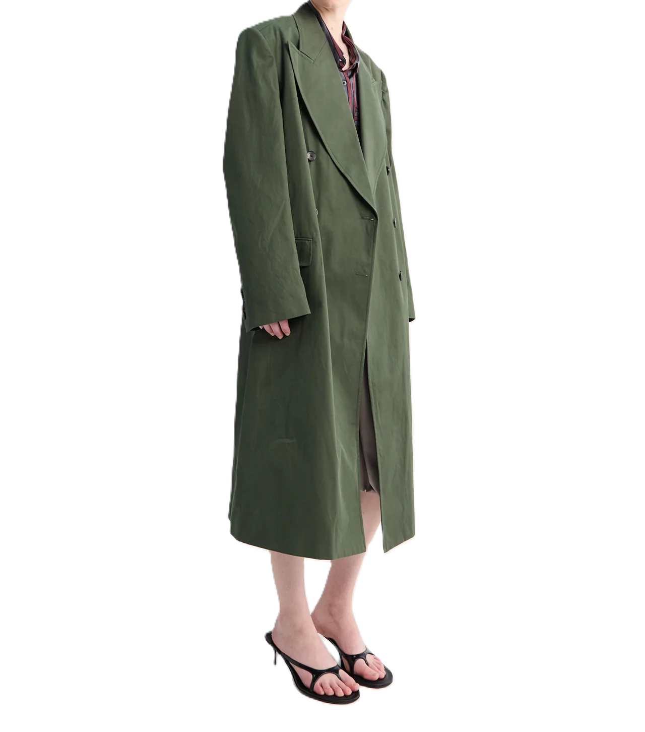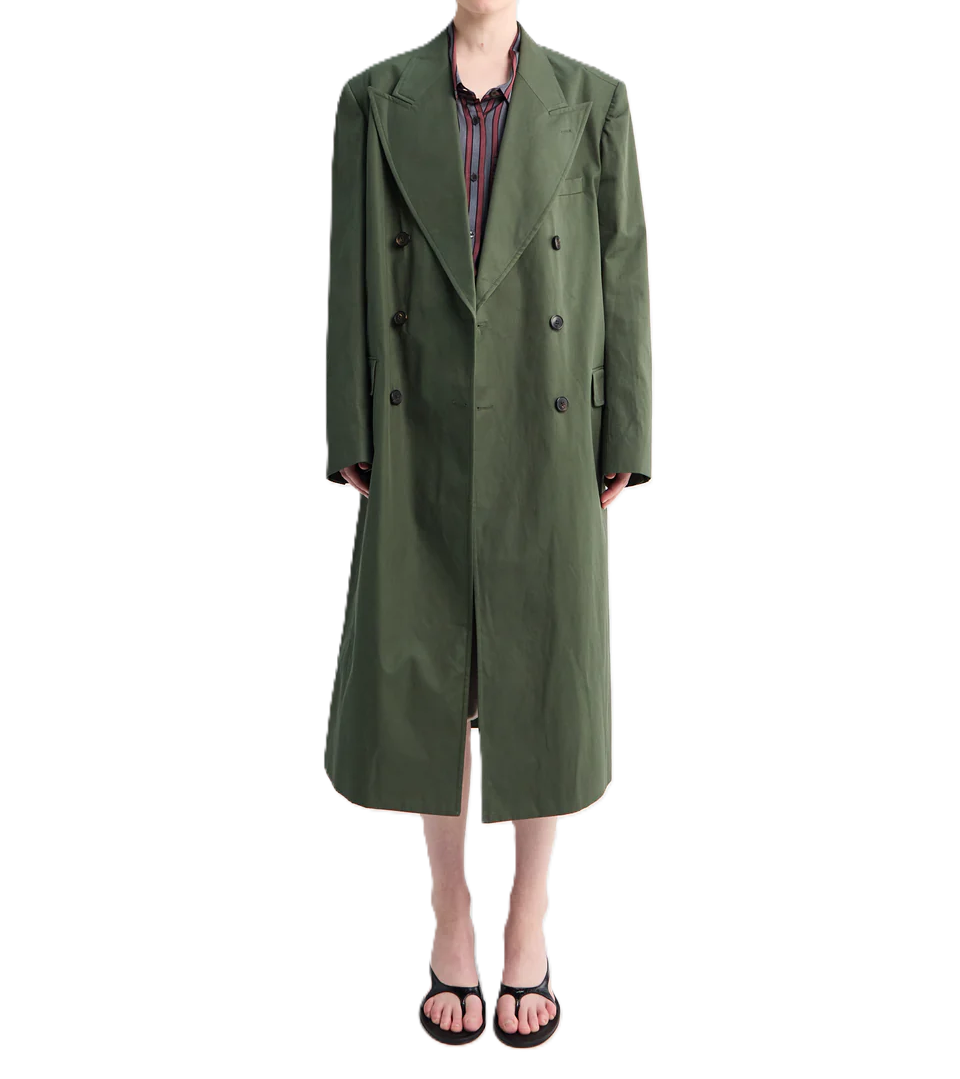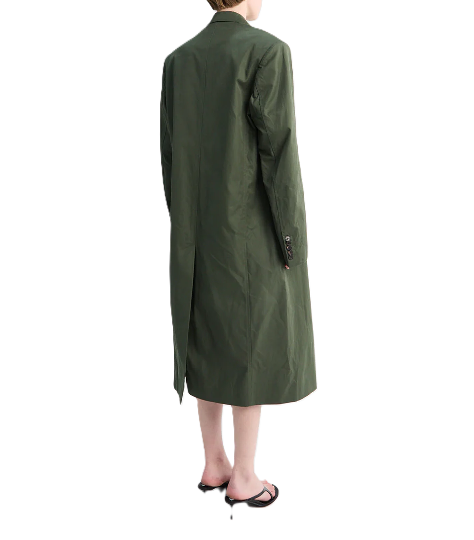 Il cappotto Rosea è espressione della raffinata sartorialità di Dries Van Noten. La sua silhouette precisa e il drappeggio impeccabile sono realizzati in un profondo verde bottiglia, a testimonianza dell'eccellente lavorazione dei materiali e della cura nella confezione.