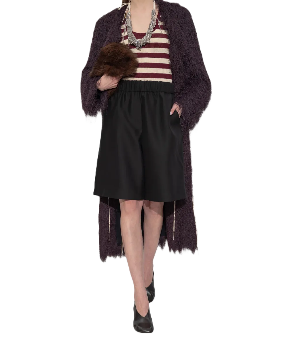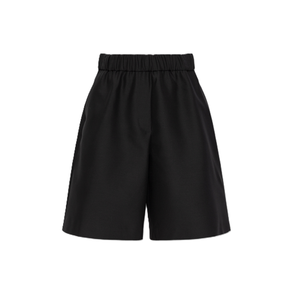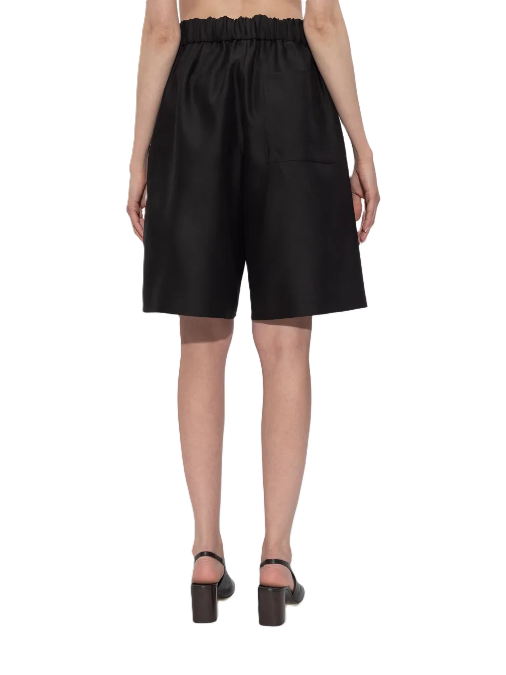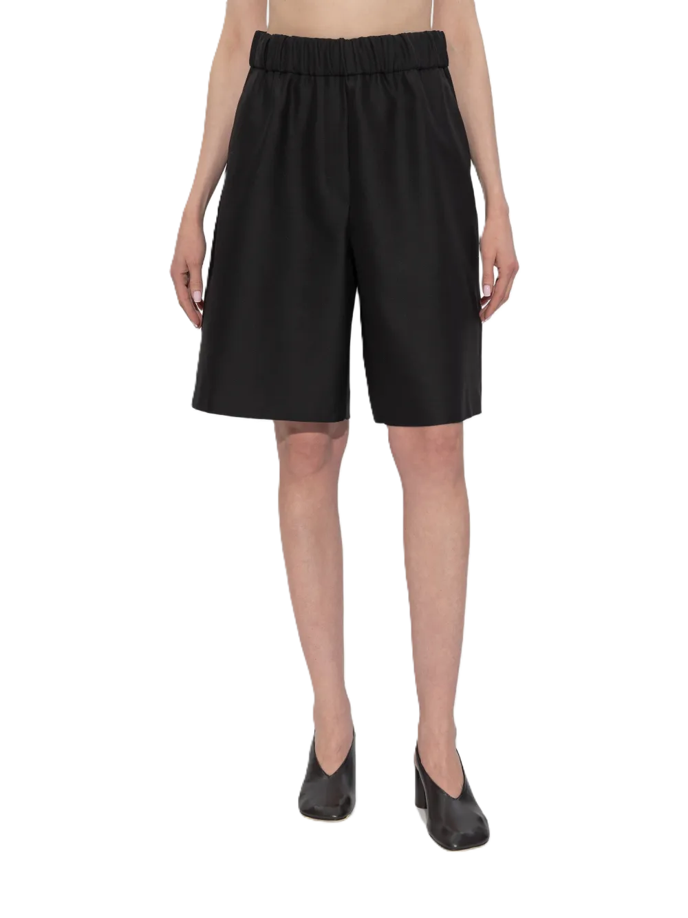 Pantaloncini Pomy in misto lana e seta, con una delicata finitura lucida, tasca posteriore, tasche laterali, vestibilità comoda, gamba larga, lunghezza al ginocchio, elastico in vita, tasche laterali oblique, design minimalista.