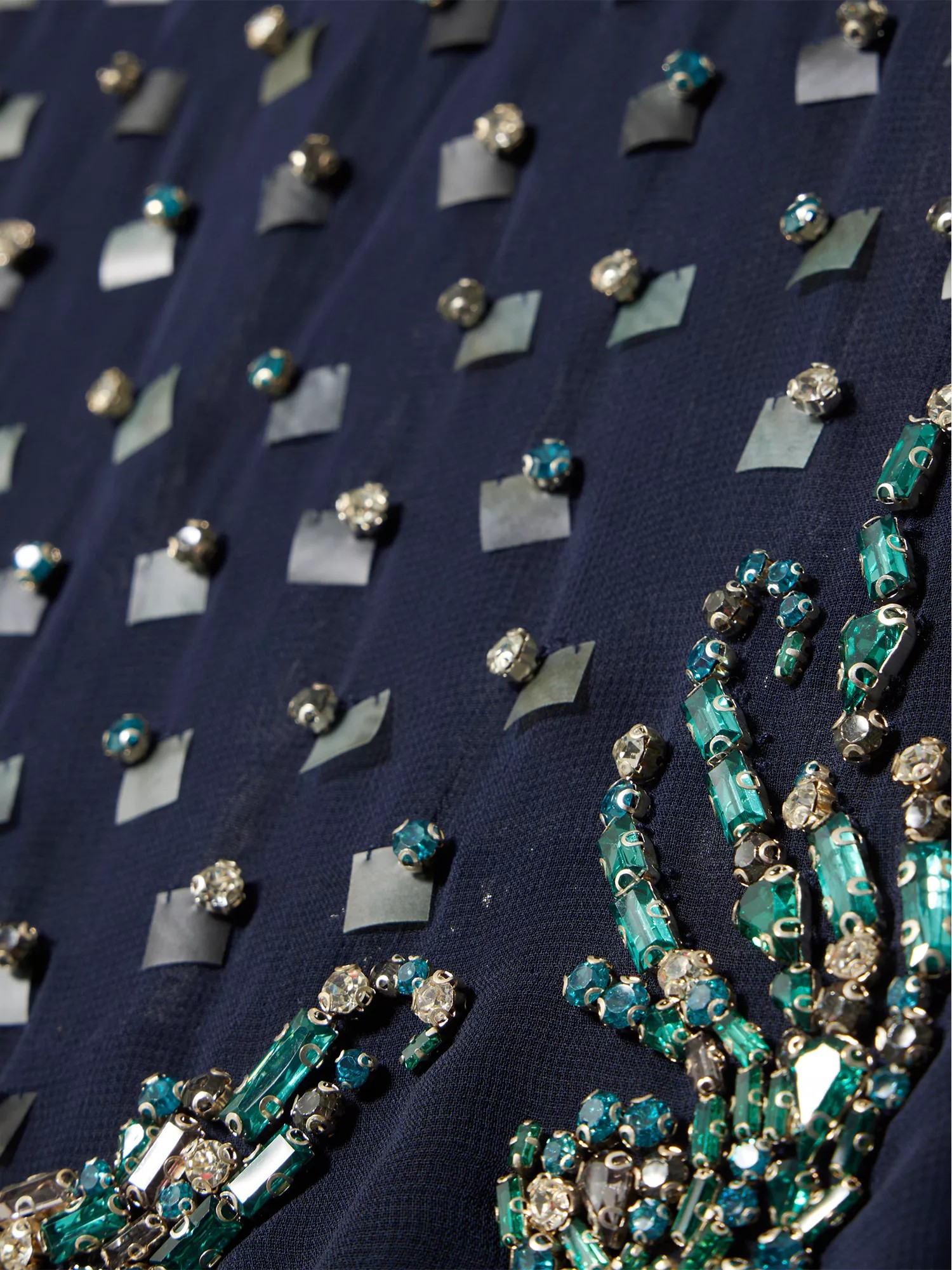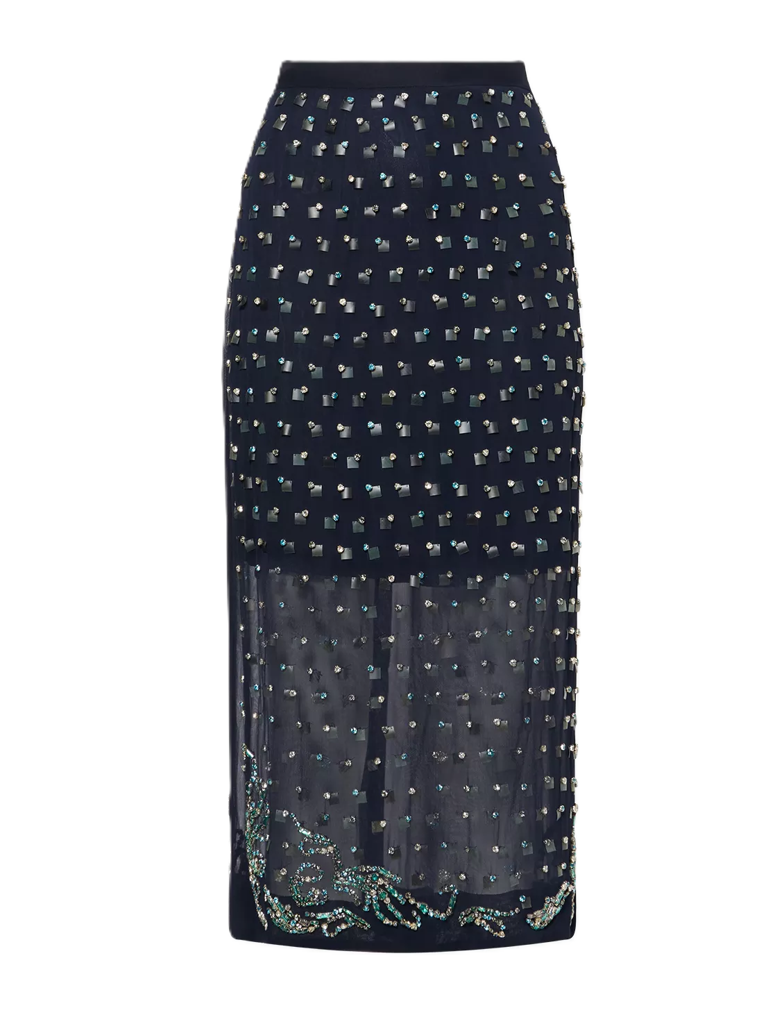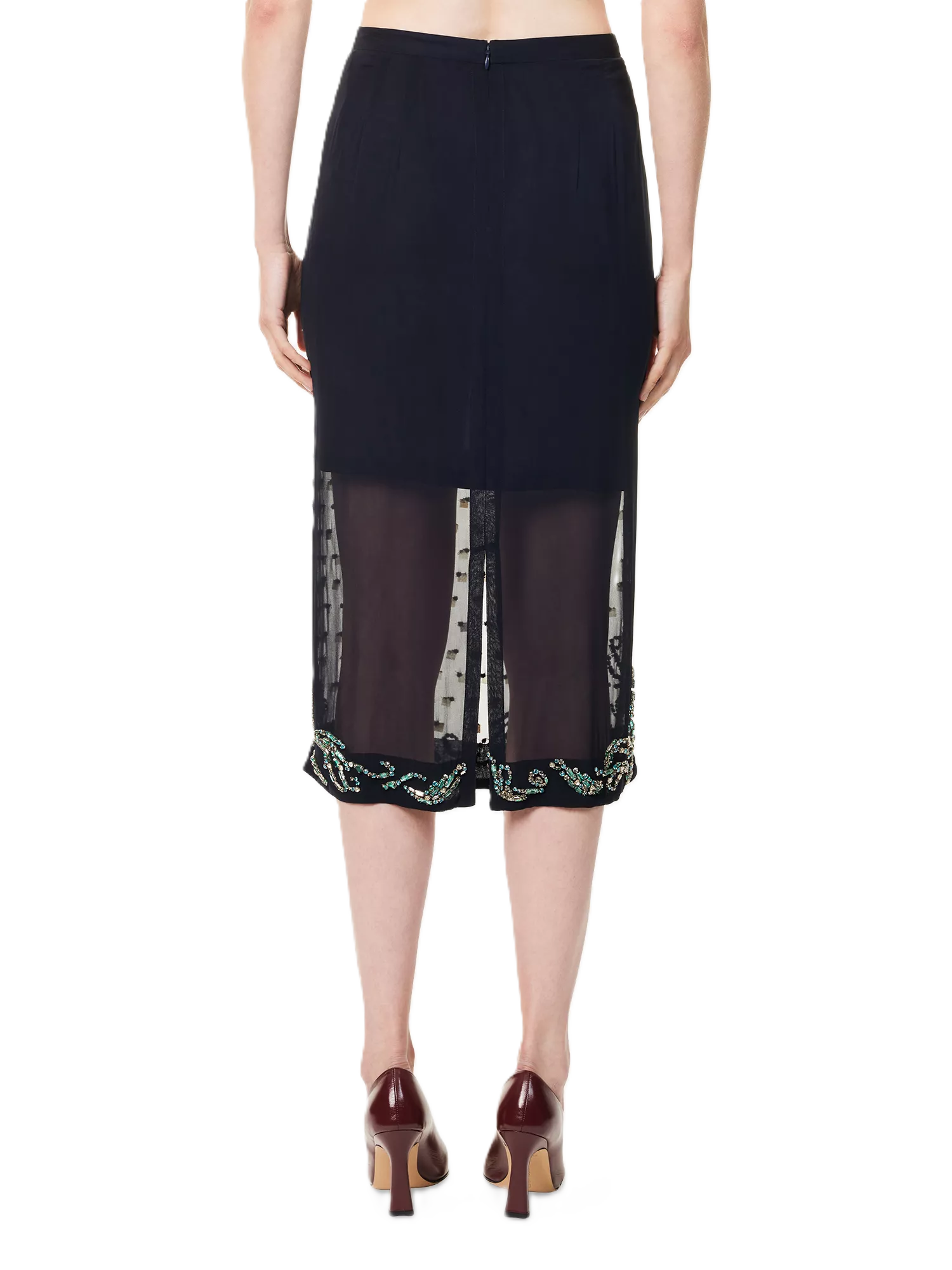 Gonna in tessuto Dries Van Noten con dettagli decorati all-over, spacco centrale sul retro, vita elasticizzata nella fodera, semi-foderata. Chiusura con zip nascosta sul retro.