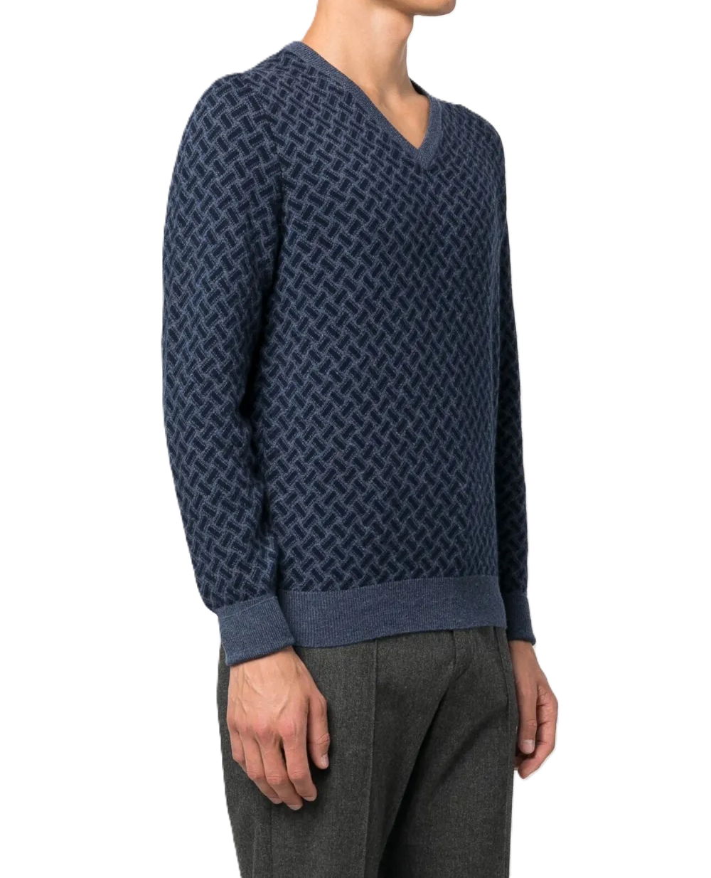 Maglia blu/blu navy in cashmere, finitura morbida spazzolata, motivo a reticolo all-over, scollo a V a coste, maniche lunghe, polsini e orlo a coste, orlo dritto