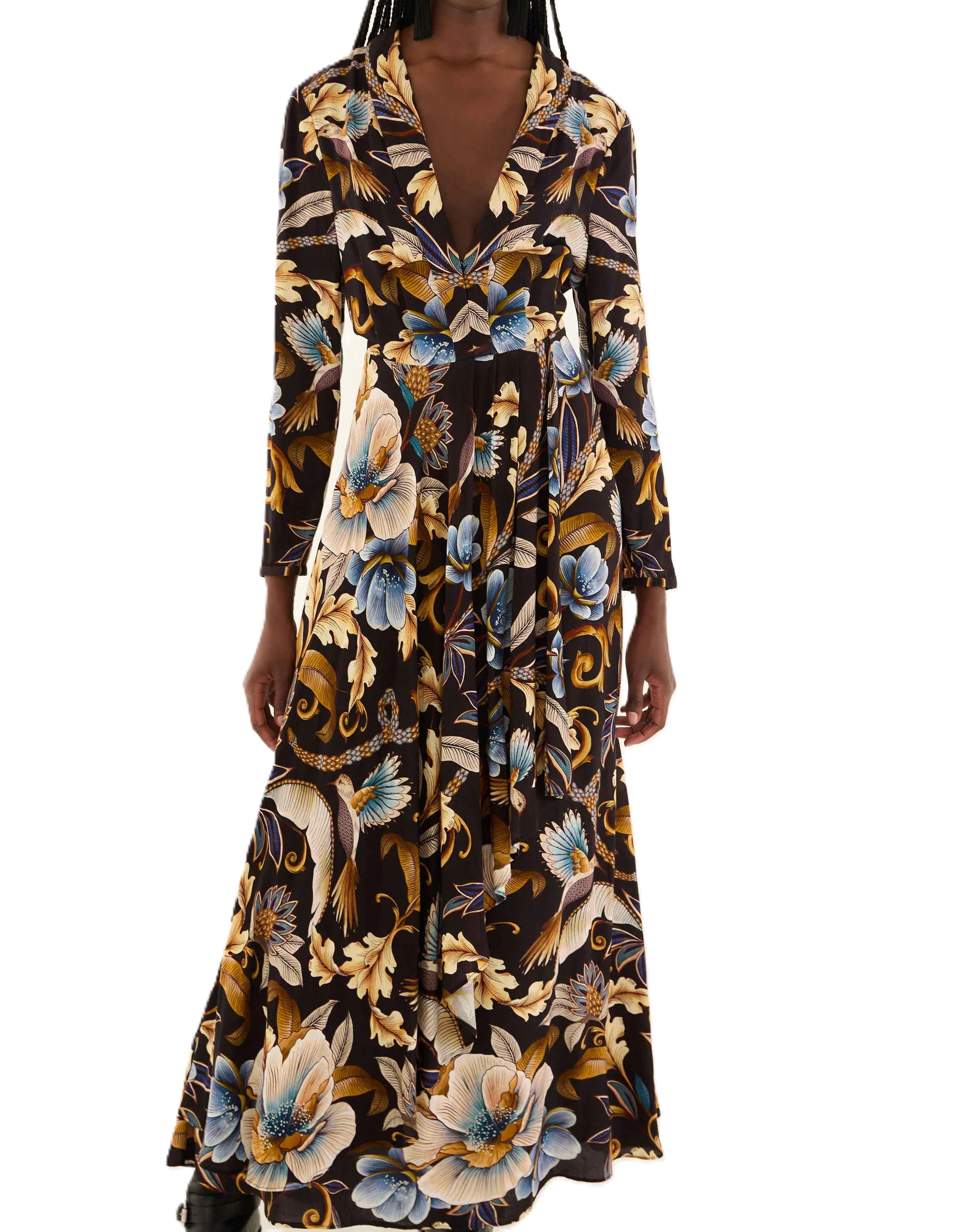 Abbraccia l'eleganza disinvolta con questo abito lungo Black Snake Garden, realizzato in viscosa ecologica Lenzing Ecovero che scorre delicatamente a ogni passo. La profonda scollatura a V e la silhouette lunga e fluida ne esaltano l'elegante semplicità, mentre l'audace sfondo nero si arricchisce di motivi floreali oversize e delicati serpenti in oro caldo, blu tenue e crema. La cintura rimovibile scolpisce il punto vita, aggiungendo un tocco giocoso ma raffinato a questo sogno botanico.