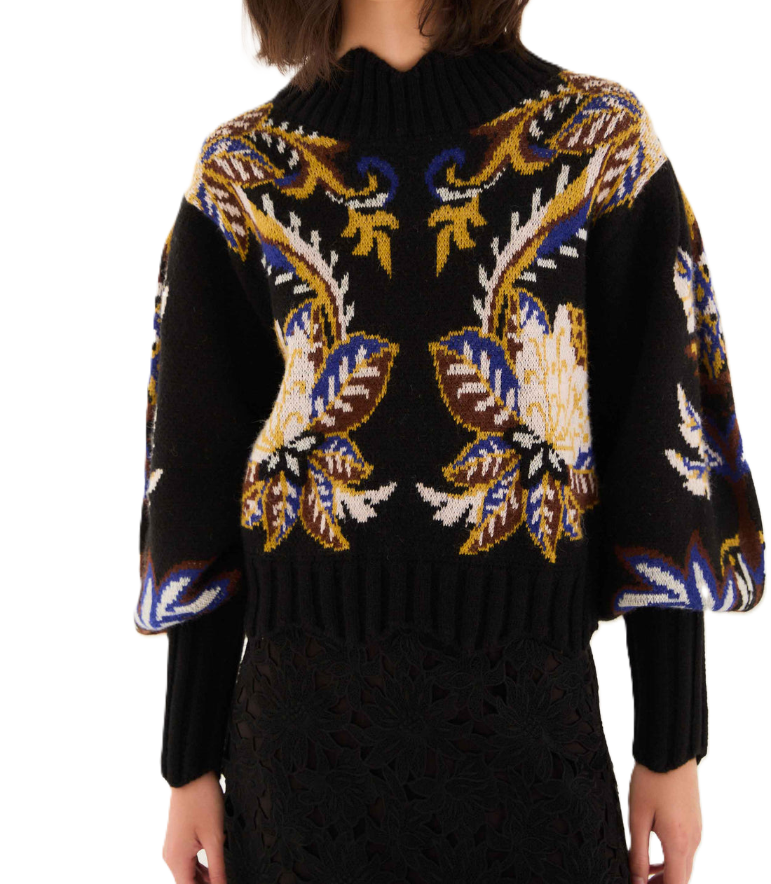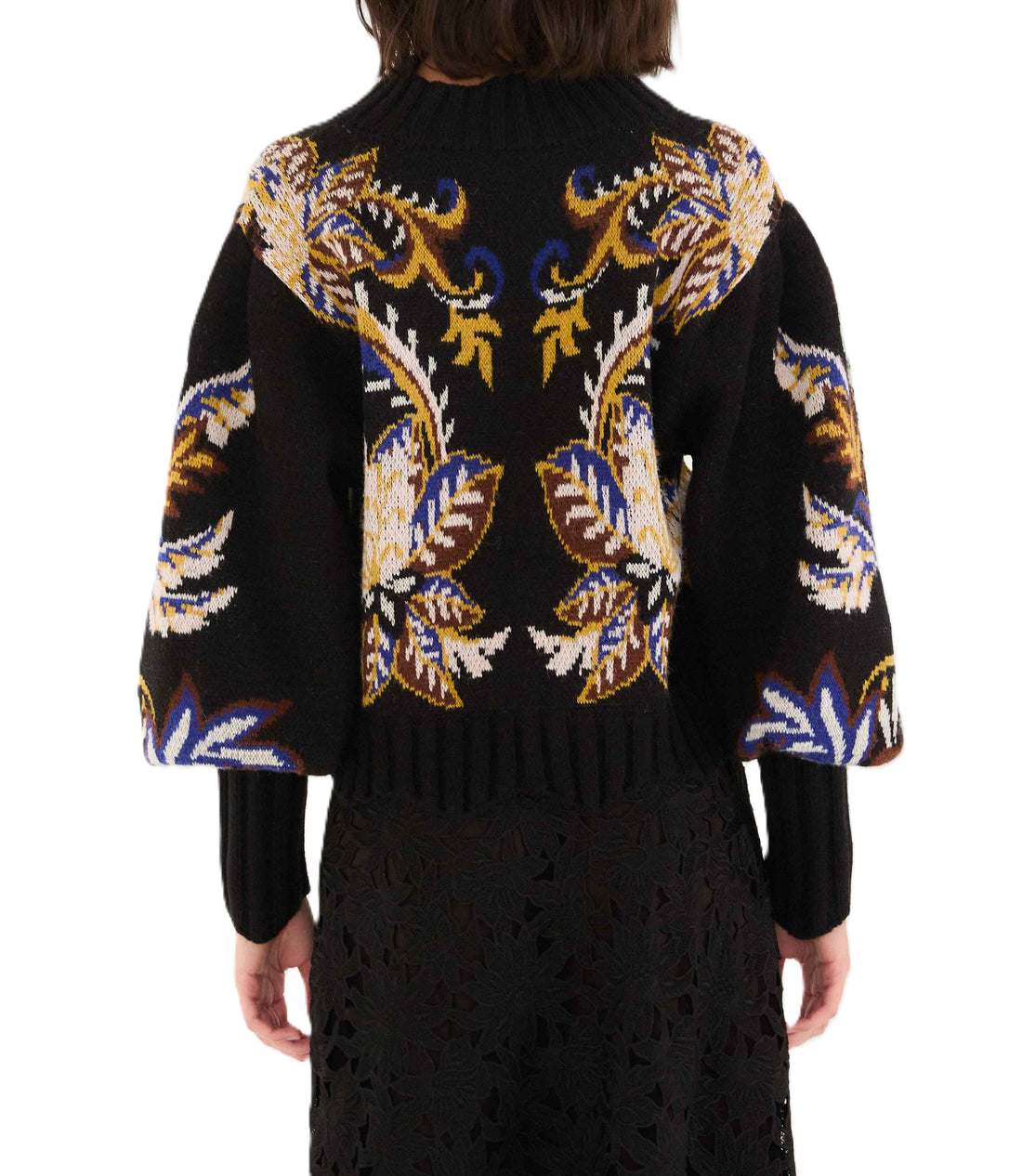 Capo lavorato a maglia Arabesque Paradise incanta con il suo scollo alto e le maniche voluminose, abbracciando una silhouette rilassata ma elegante. Realizzato in un nero intenso, presenta un ricco motivo arabesco nelle calde tonalità dell'oro, del blu reale e del bianco crema, evocando un senso di spirito avventuroso e di accogliente raffinatezza. Questo capo in maglia invita a un fascino giocoso e a uno stile senza tempo, perfetto per momenti di sovrapposizione pieni di calore e arte.
