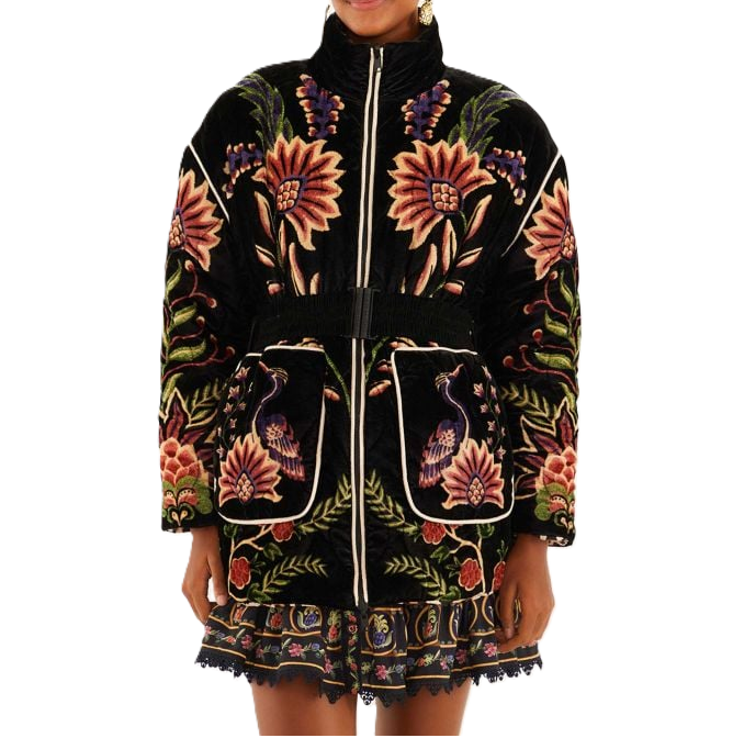 Il piumino reversibile Marvellous Garden di FARM Rio è un giubbotto imbottito con collo alto e chiusura a zip a tutta lunghezza. Presenta una vita elasticizzata con fibbia per una silhouette aderente, ampie tasche applicate con bordino profilato e trapuntatura a vista per una maggiore struttura. Ricami dettagliati decorano il corpo e le maniche, mentre una targhetta con logo in gomma è presente sul braccio. Ideale per il layering, questo piumino bilancia dettagli decorativi con dettagli pratici come la cerniera di sicurezza e le ampie tasche.