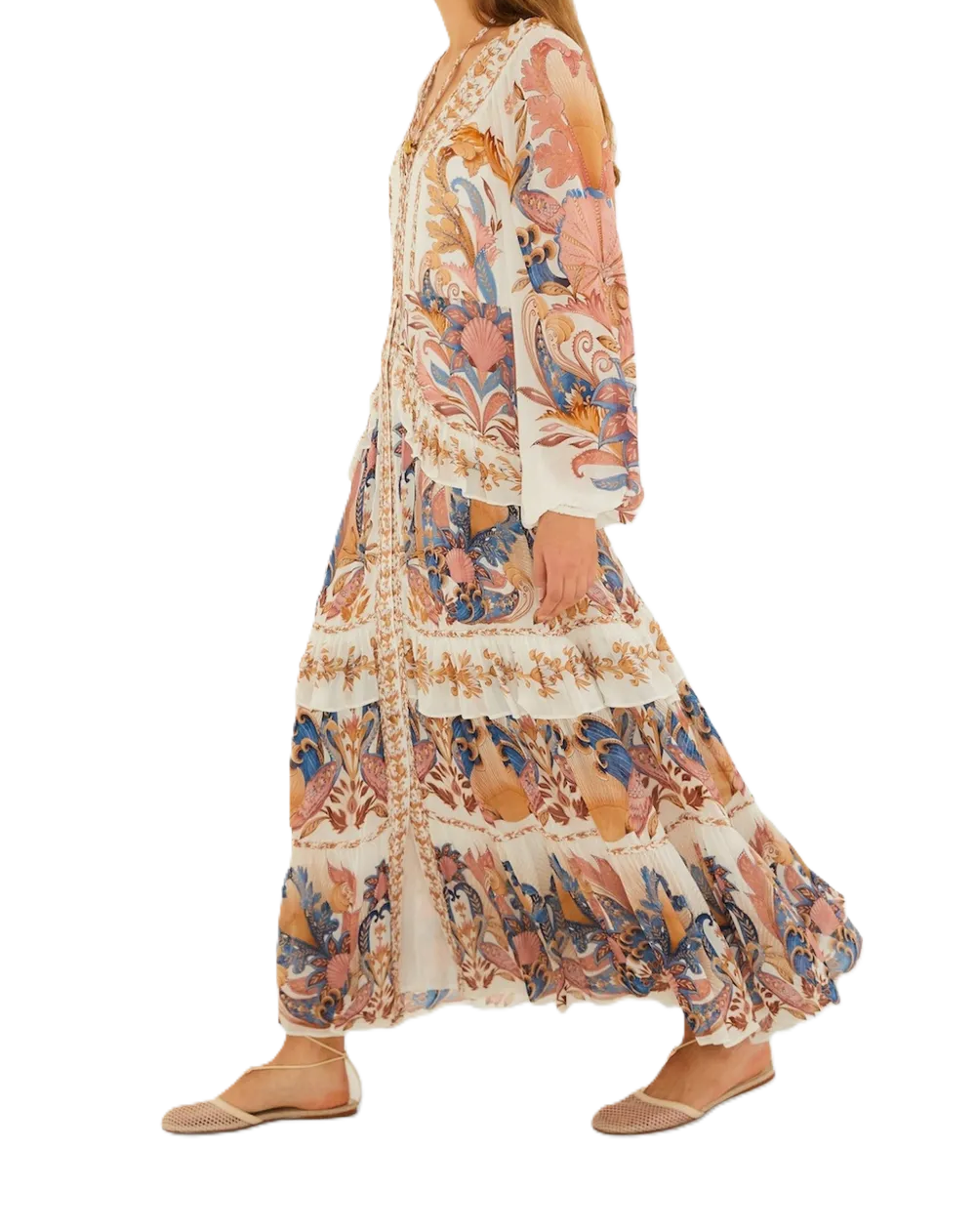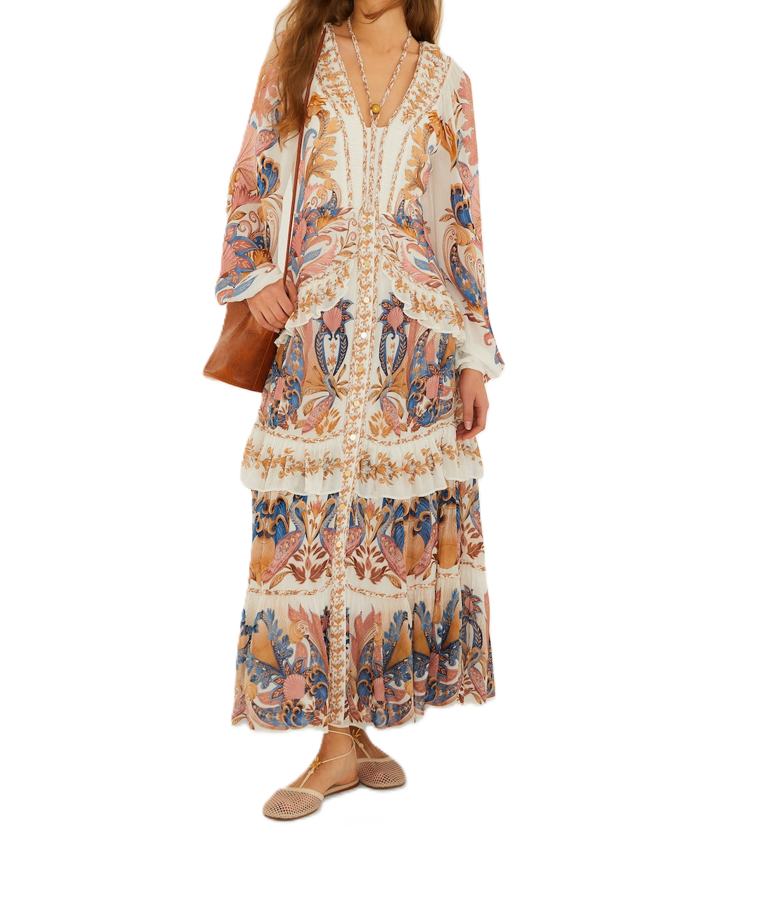 Abito avorio con stampa a fiori, scollo a V, maniche lunghe, gonna con balze, dettagli con ruches