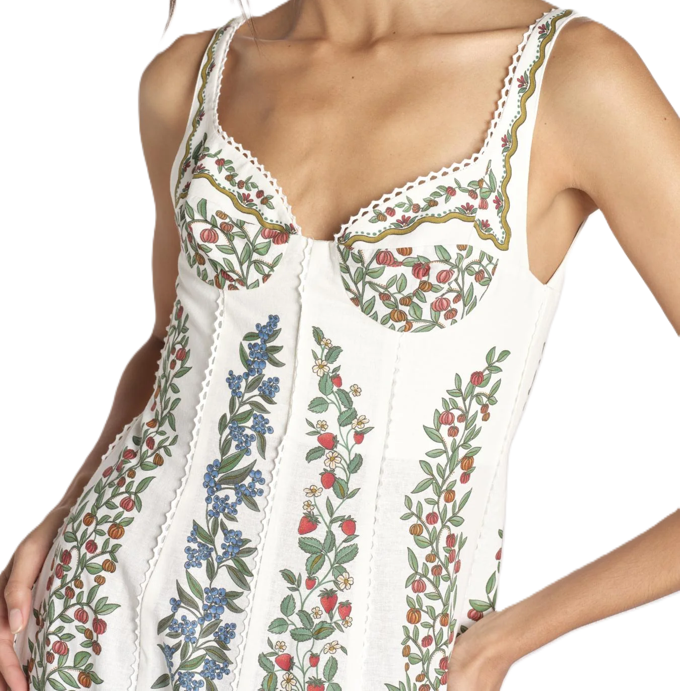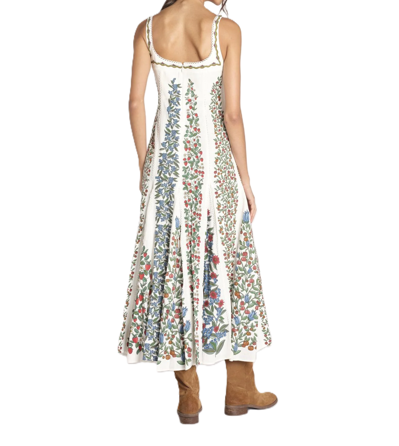 L'abito lungo Farm Rio Fruit Beauty è realizzato in un tessuto leggero e presenta una scollatura a balconcino dalla struttura morbida, impreziosita da ricami. Le spalline fisse incorniciano il corpetto sagomato, creando una silhouette definita che scende in una gonna lunga con motivi di tralci di frutta. La parte posteriore presenta una finitura pulita con chiusura a zip, completando il look con una struttura raffinata e femminile.