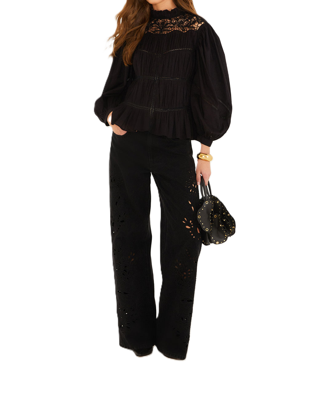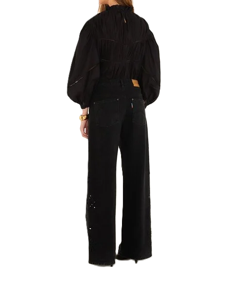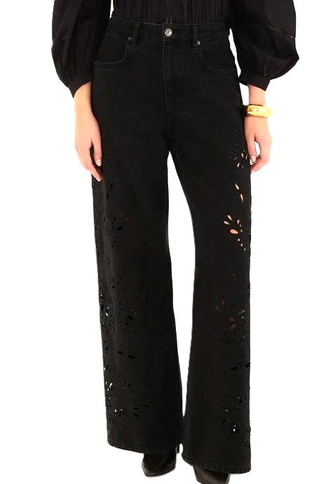 Pantaloni in denim Richelieu neri con ritagli decorativi.