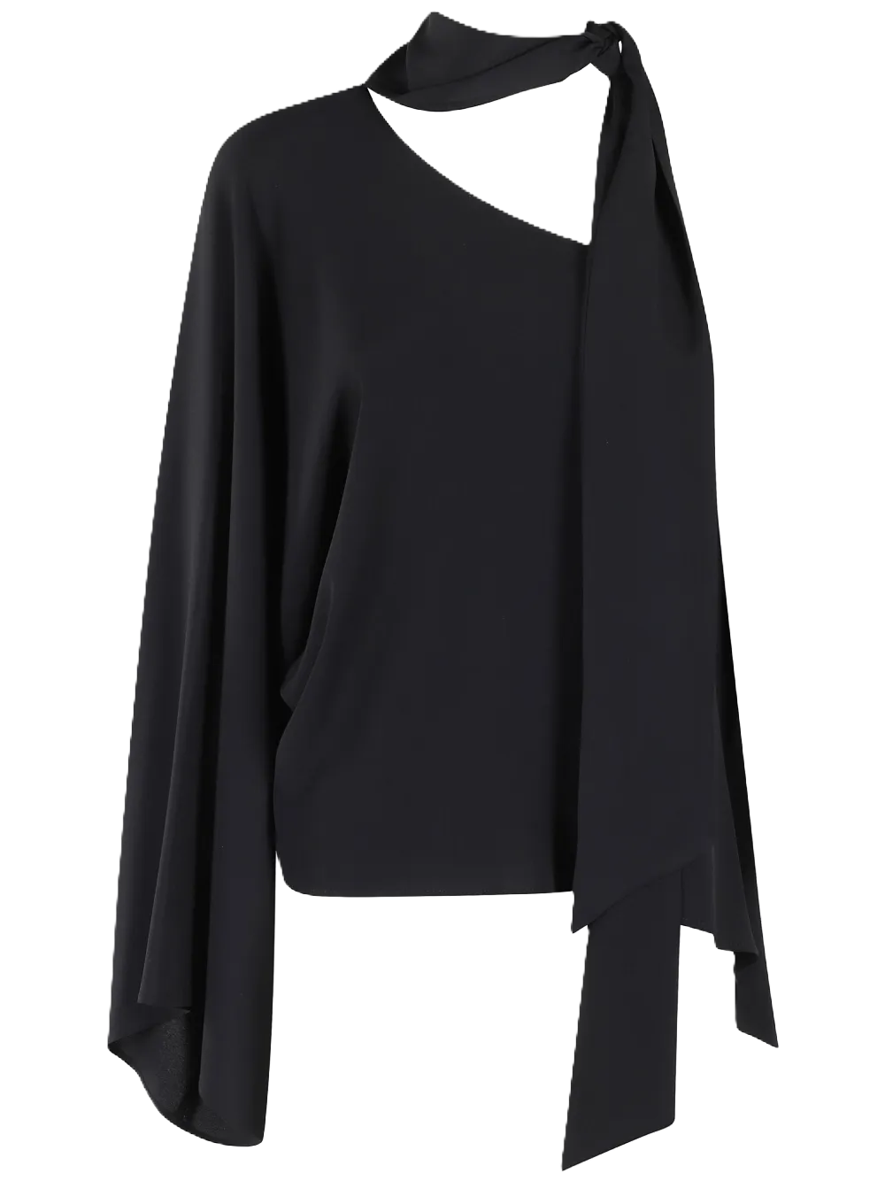 Blusa in crêpe-de-chine nero, inserto stile foulard, design monospalla, manica lunga singola.