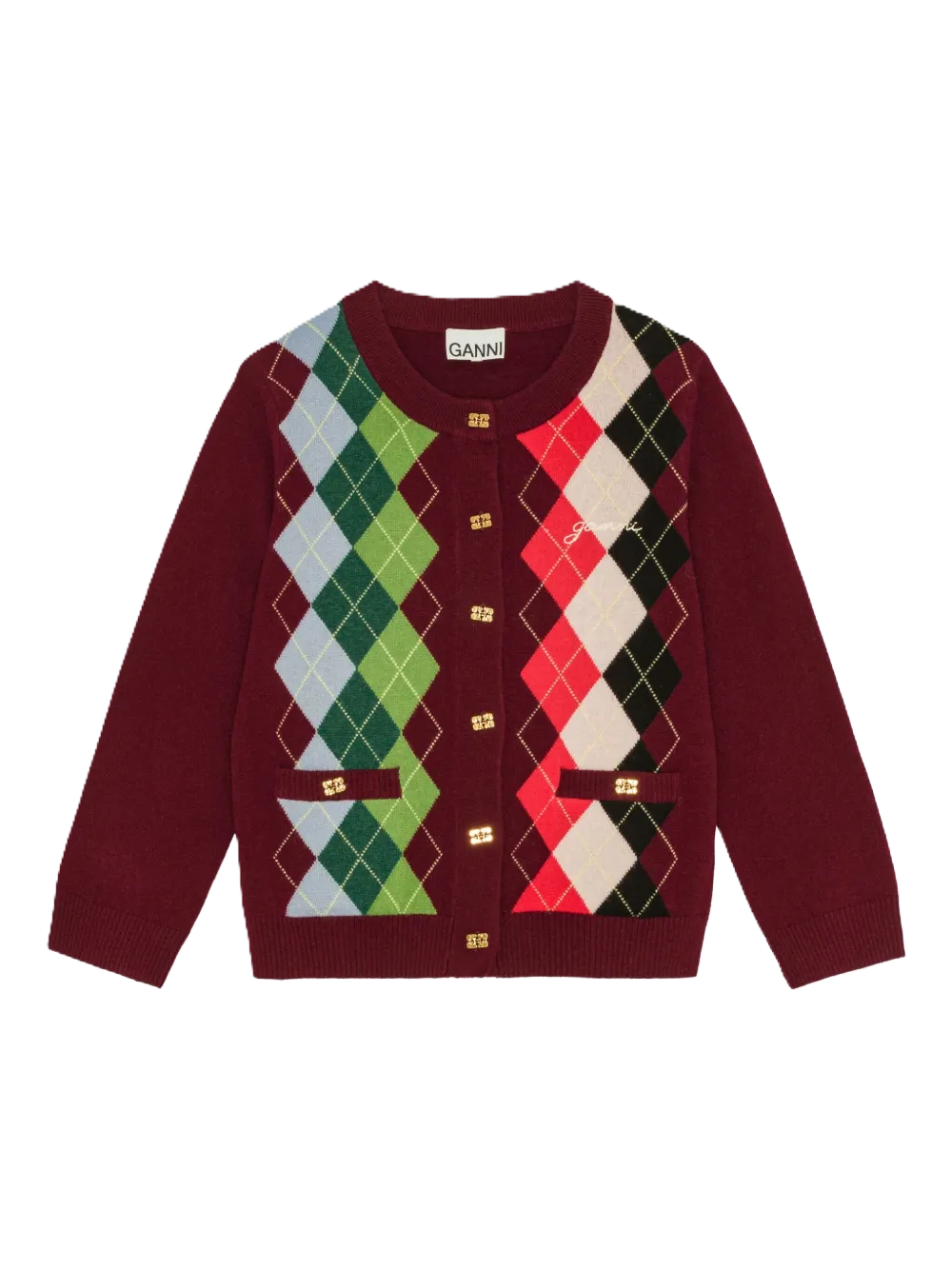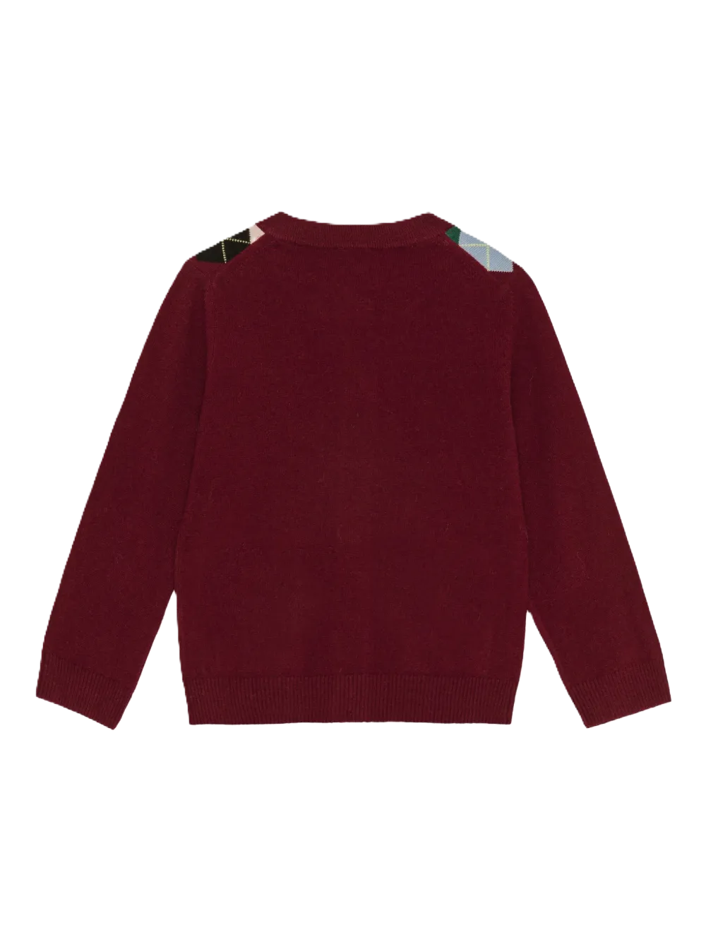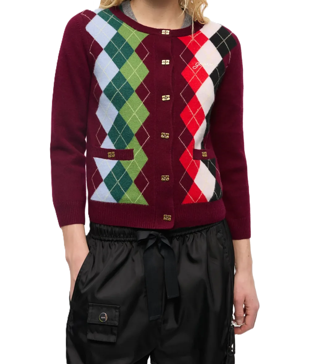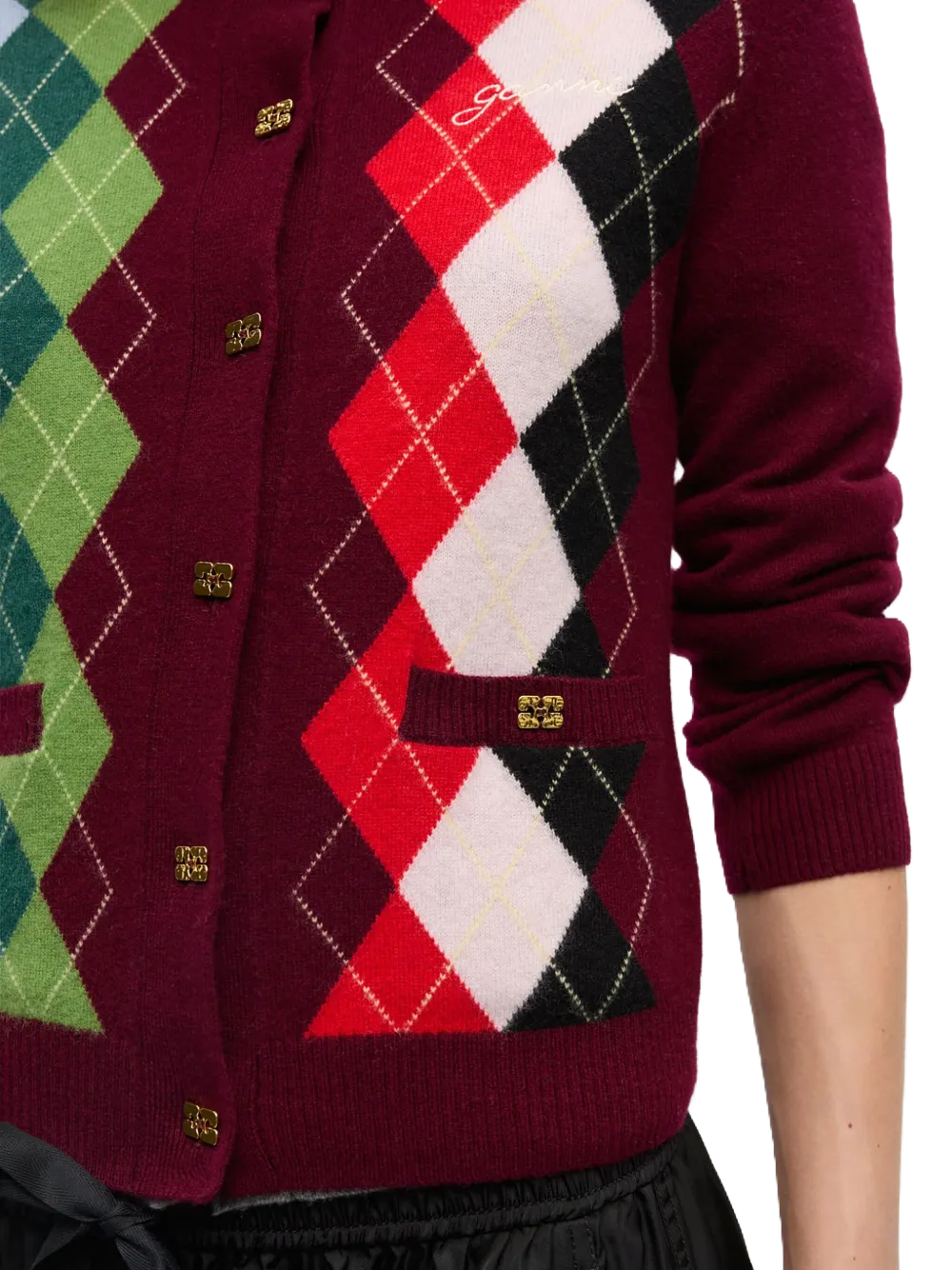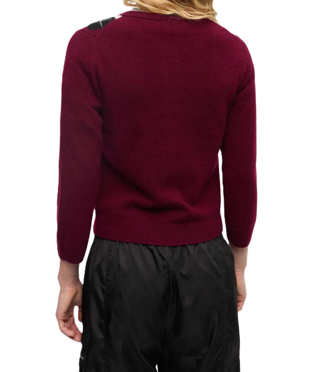 Cardigan a rombi borgogna, chiusura frontale con abbottonatura, due tasche a filetto frontali, logo sul petto, orlo e polsini a coste.
