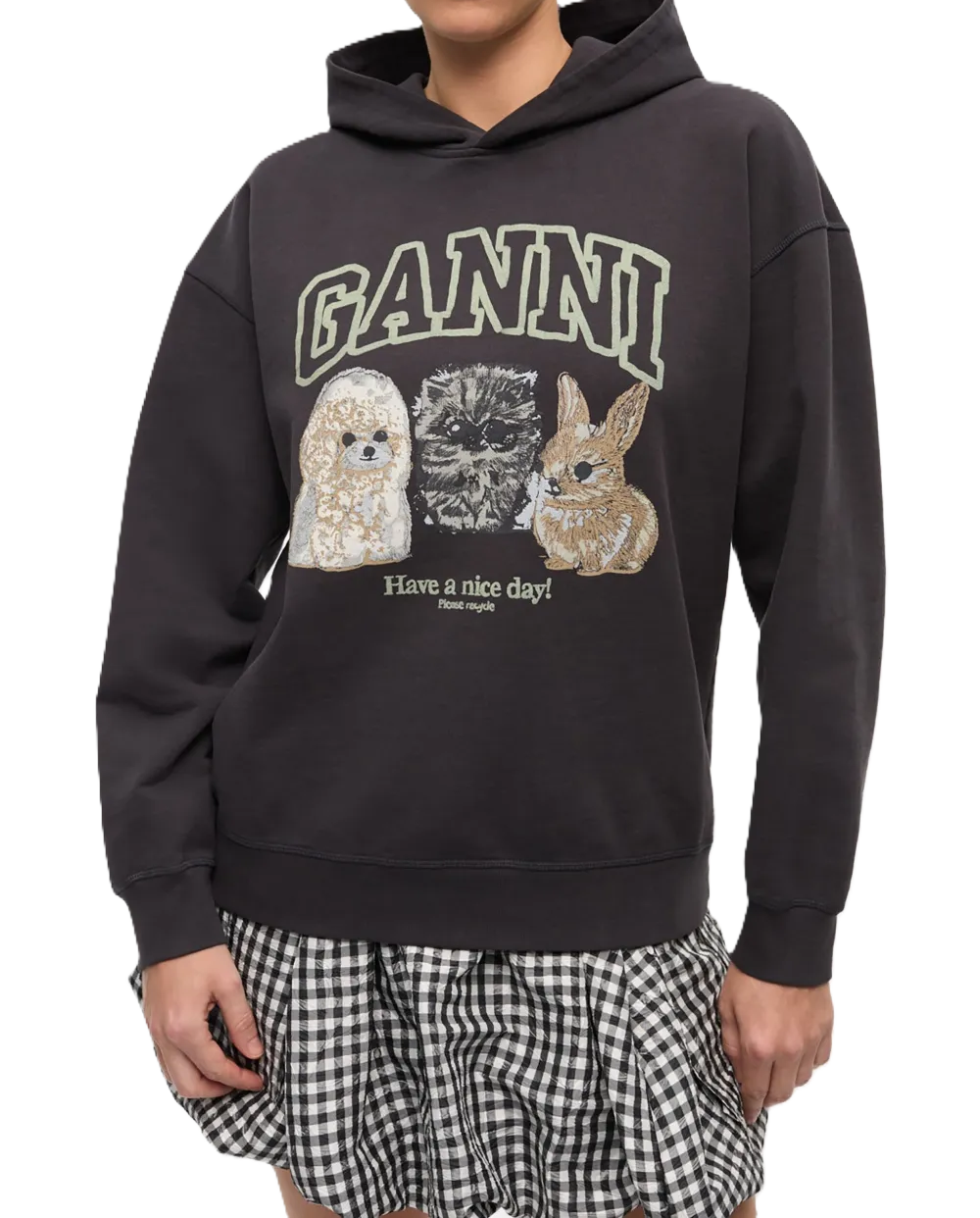 Felpa color nero, con cappuccio, spalle scese, orlo e polsini a coste, stampa grafica sul davanti.