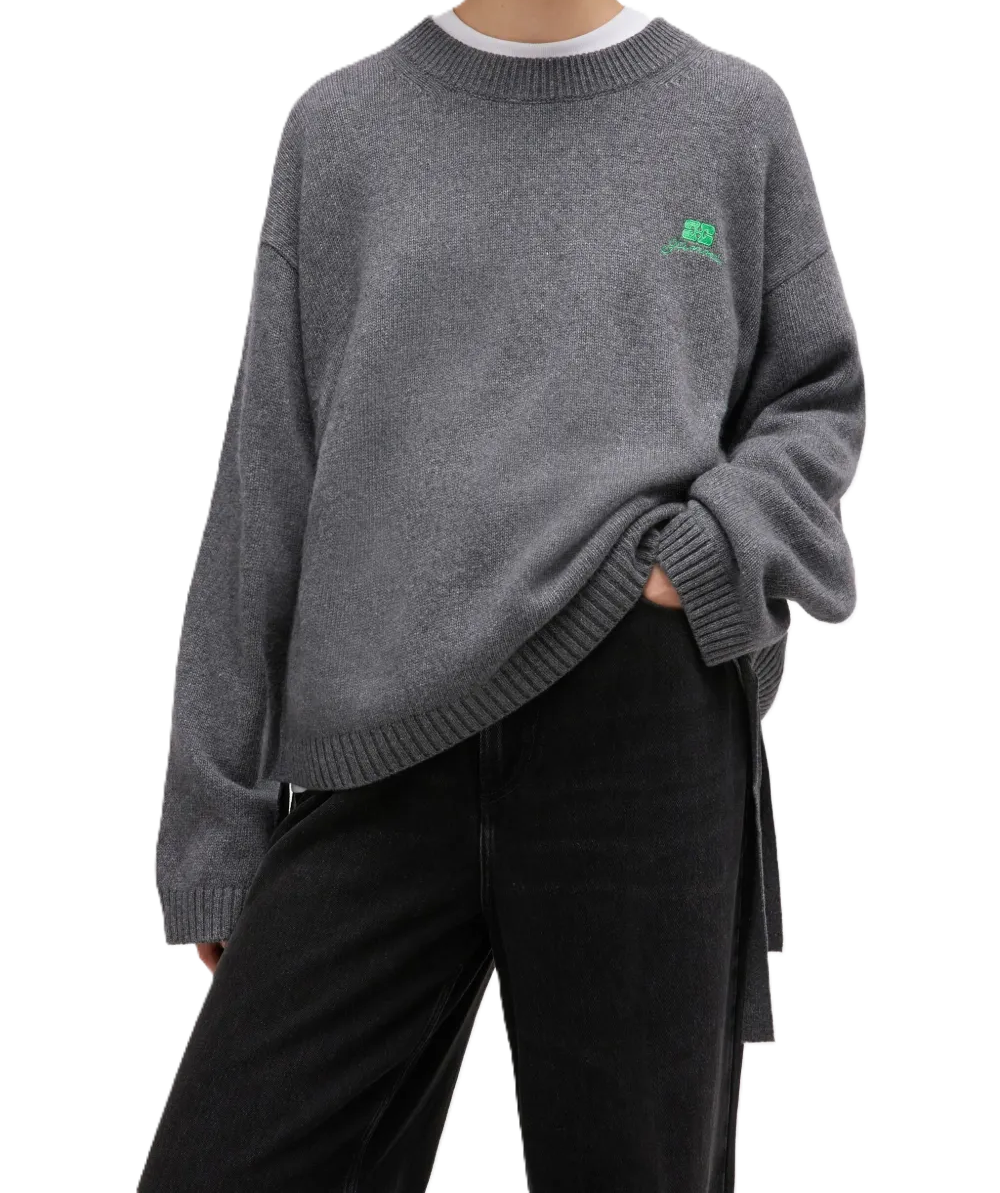 Maglione con coulisse grigio, dettaglio ricamato, girocollo, maniche lunghe, orlo a coste