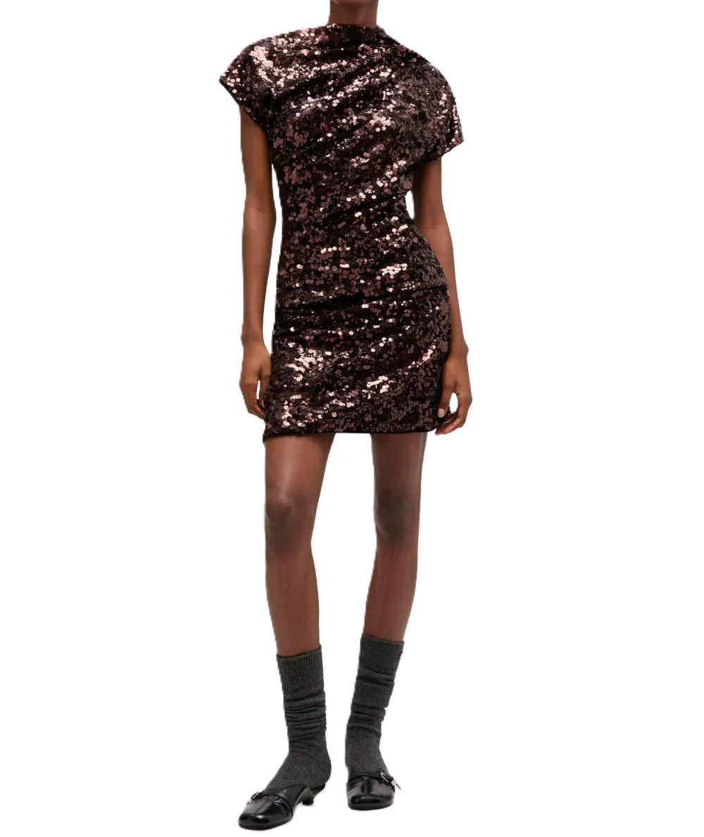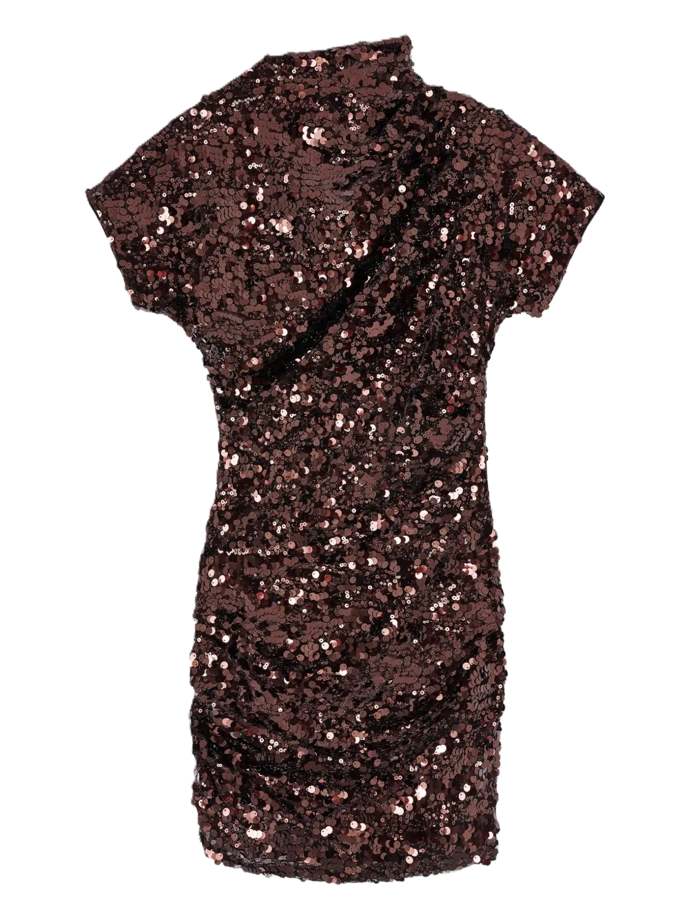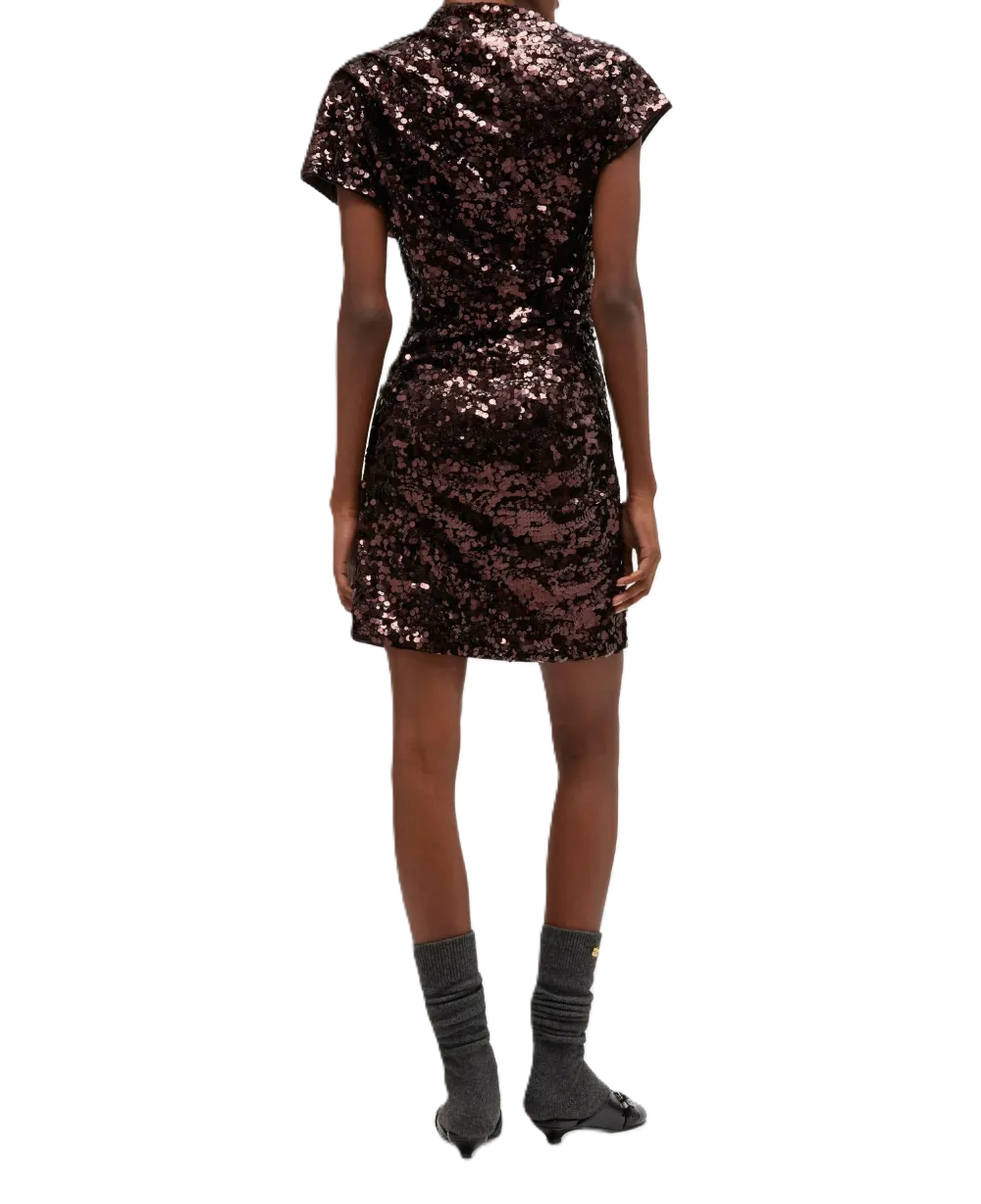 Vestito corto marrone e decorazione con paillettes, maniche corte, dettaglio drappeggiato