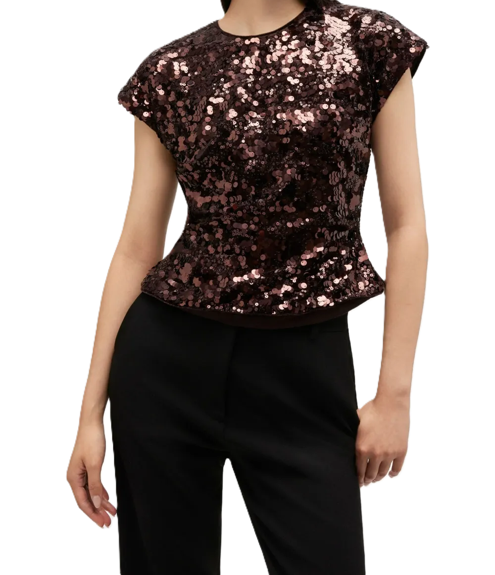Top marrone cn decorazione all-over con paillettes. maniche corte