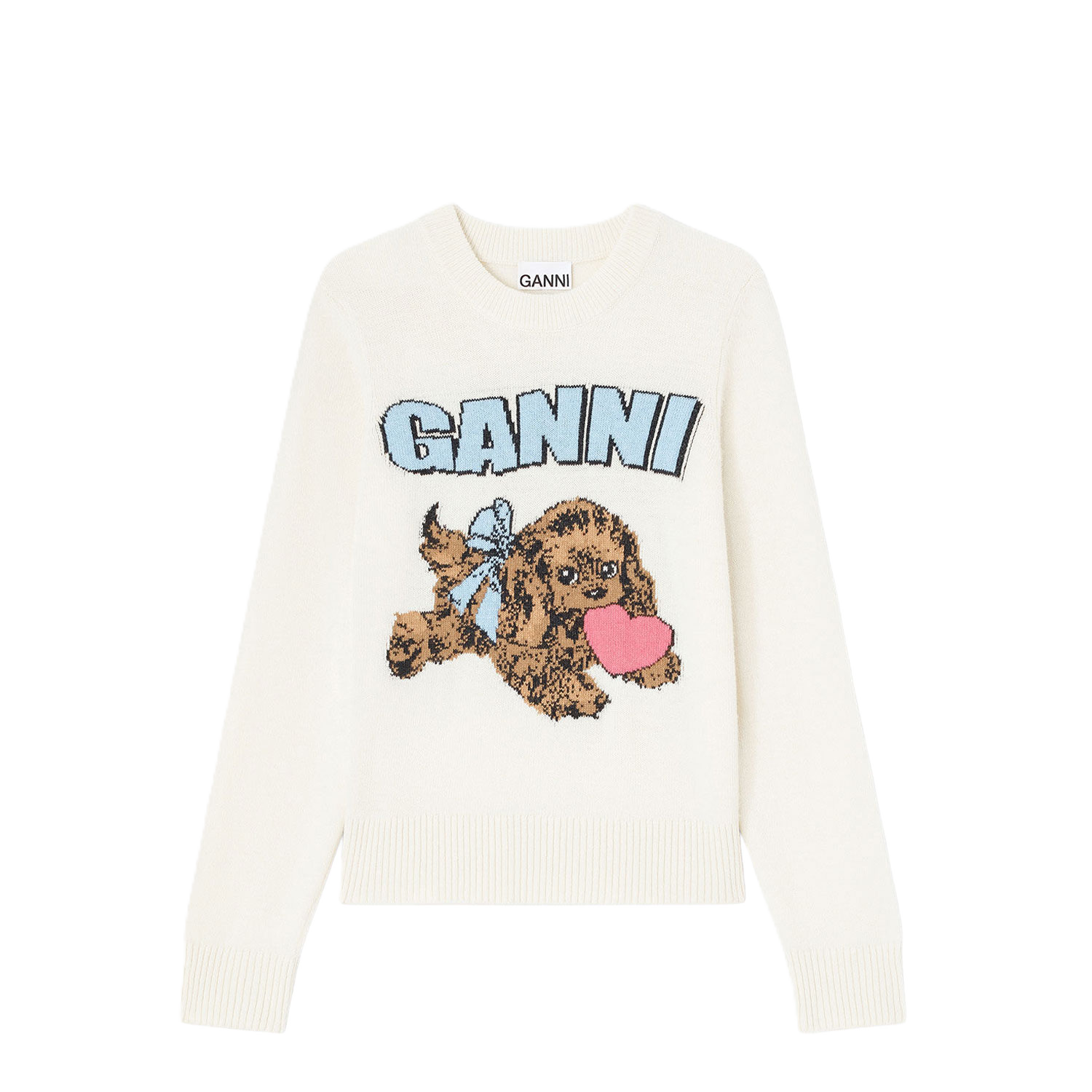 Questo maglione presenta scollo rotondo, maniche lunghe, bordi a coste, una stampa con un cucciolo e il logo GANNI.