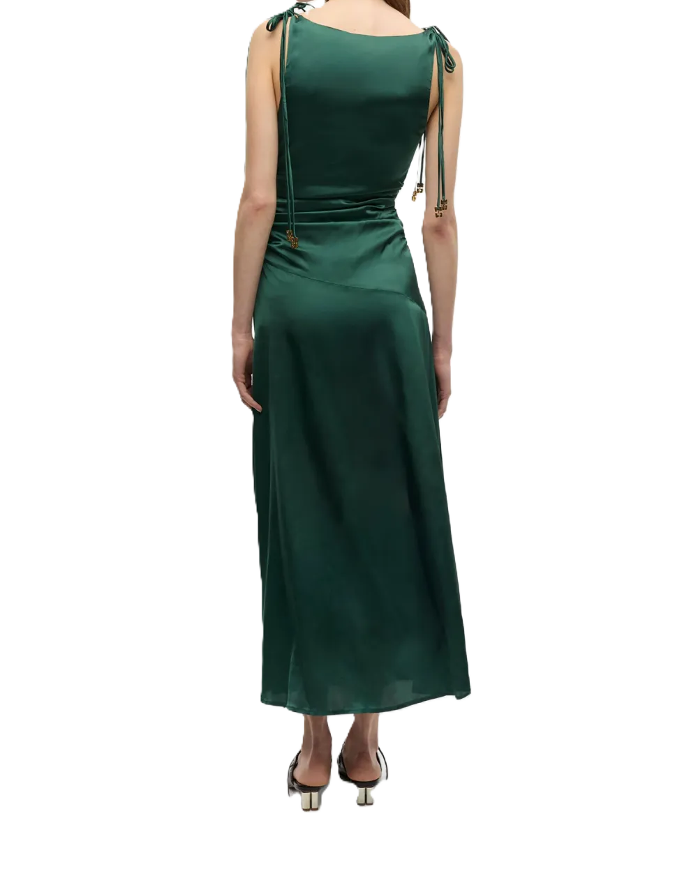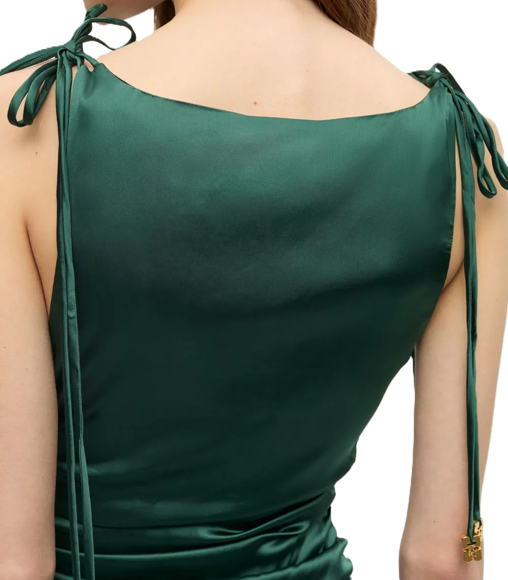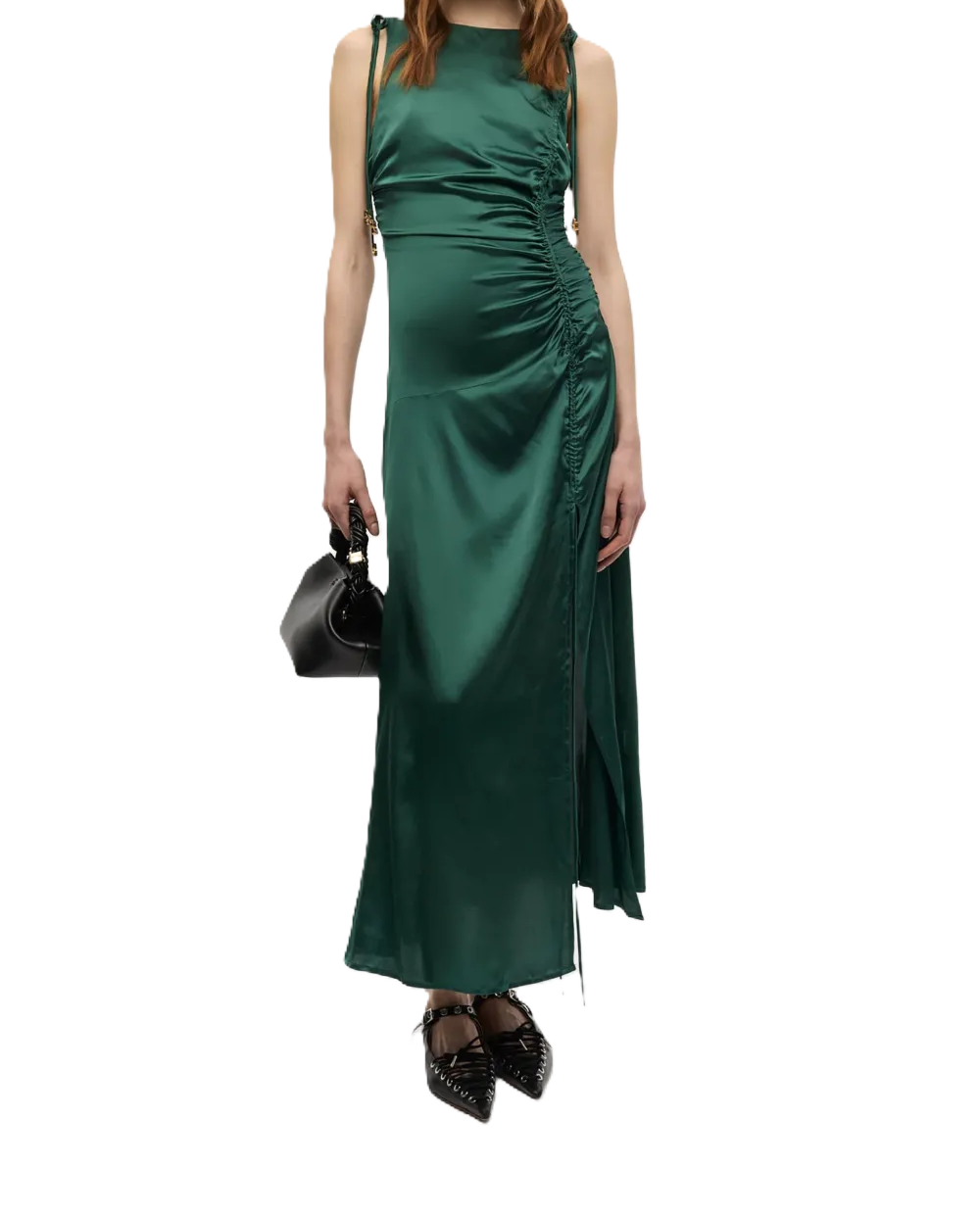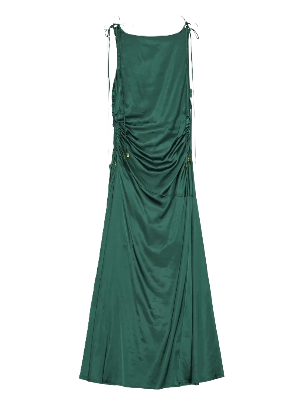 Questo abito presenta una scollatura rotonda, lacci regolabili sulle spalle, arricciature lungo il corpetto e uno spacco profondo con lacci decorativi con il logo GANNI Butterfly.