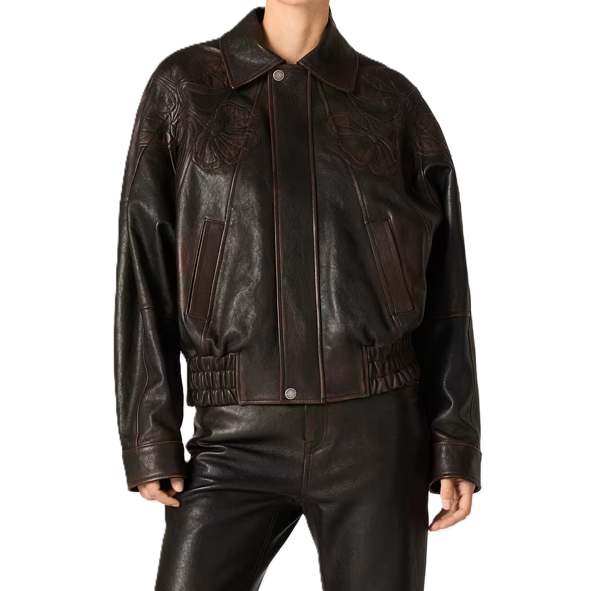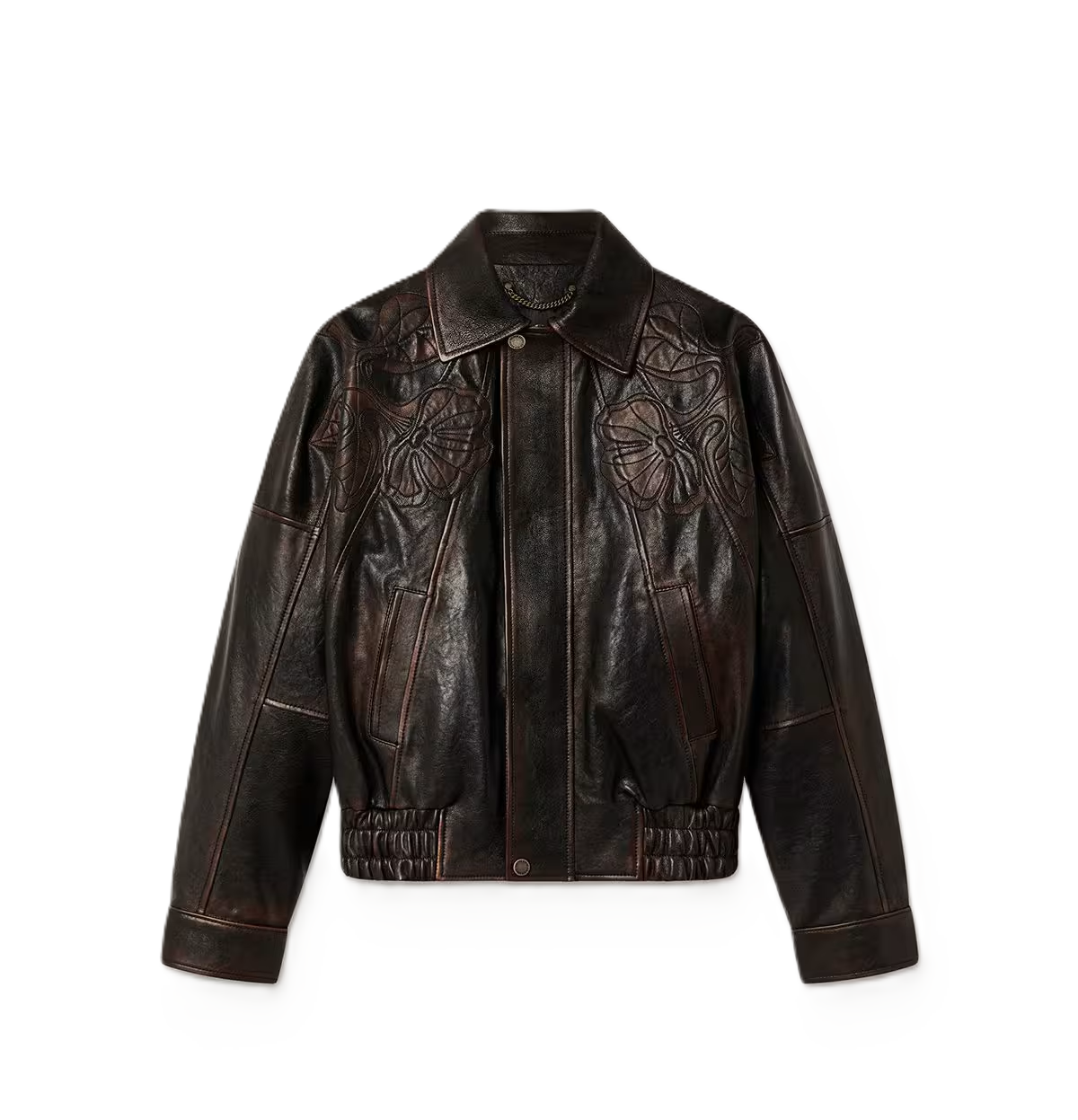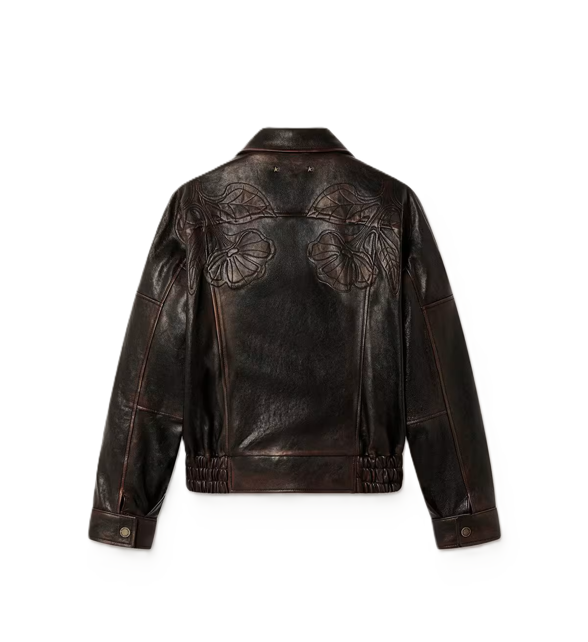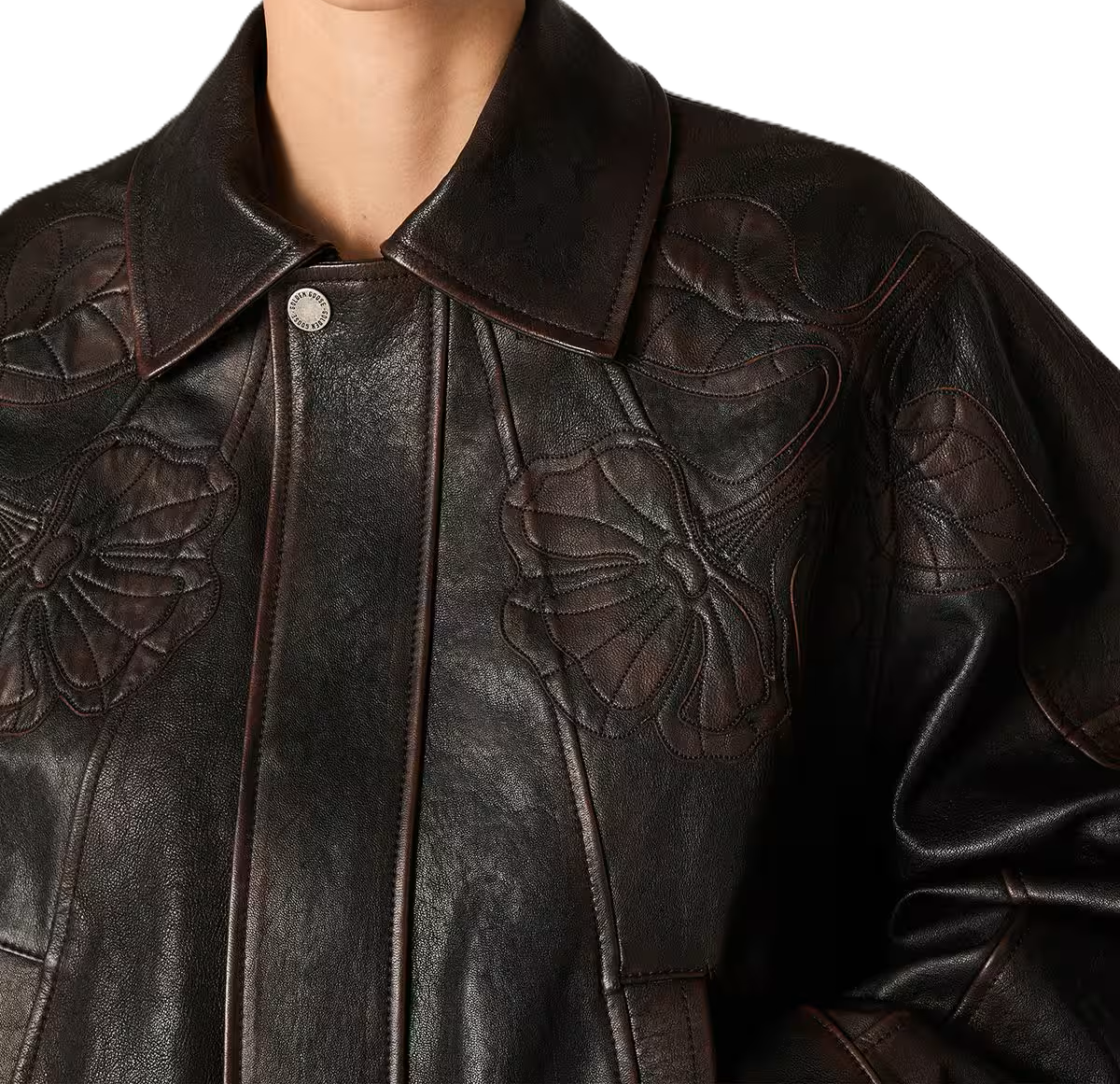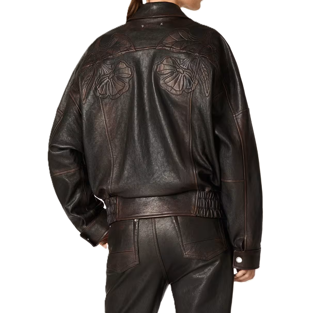 La nostra Collezione Holiday unisce magistralmente tessuti a trama fitta e tagli sartoriali, abbinandoli a morbidi capi in maglia, velluto, stampe floreali d'archivio e raso dai riflessi perfetti. Realizzata in morbida nappa color borgogna scuro, questa giacca bomber oversize da donna si caratterizza per i ricami floreali tagliati a laser sul davanti e sul retro, e per le tasche a filetto sul davanti. Il trattamento localizzato nei punti di maggior usura dona al capo un effetto lived-in autentico, mentre l'iconica doppia stellina sul retro completa il design.