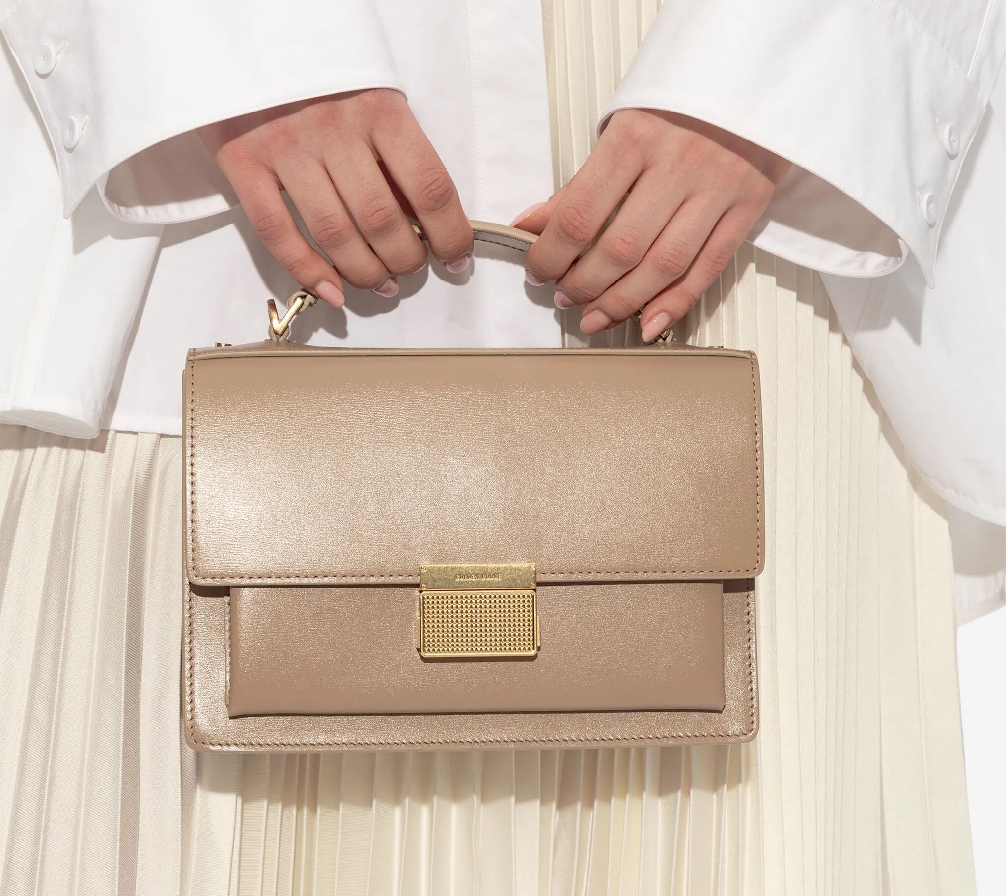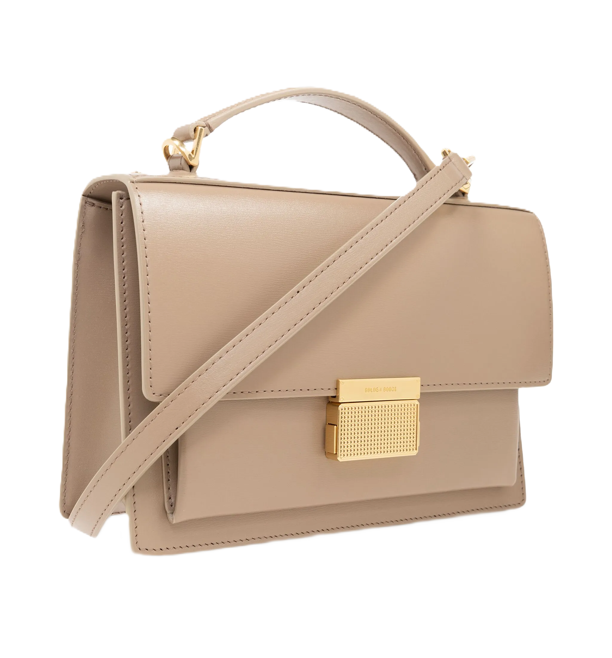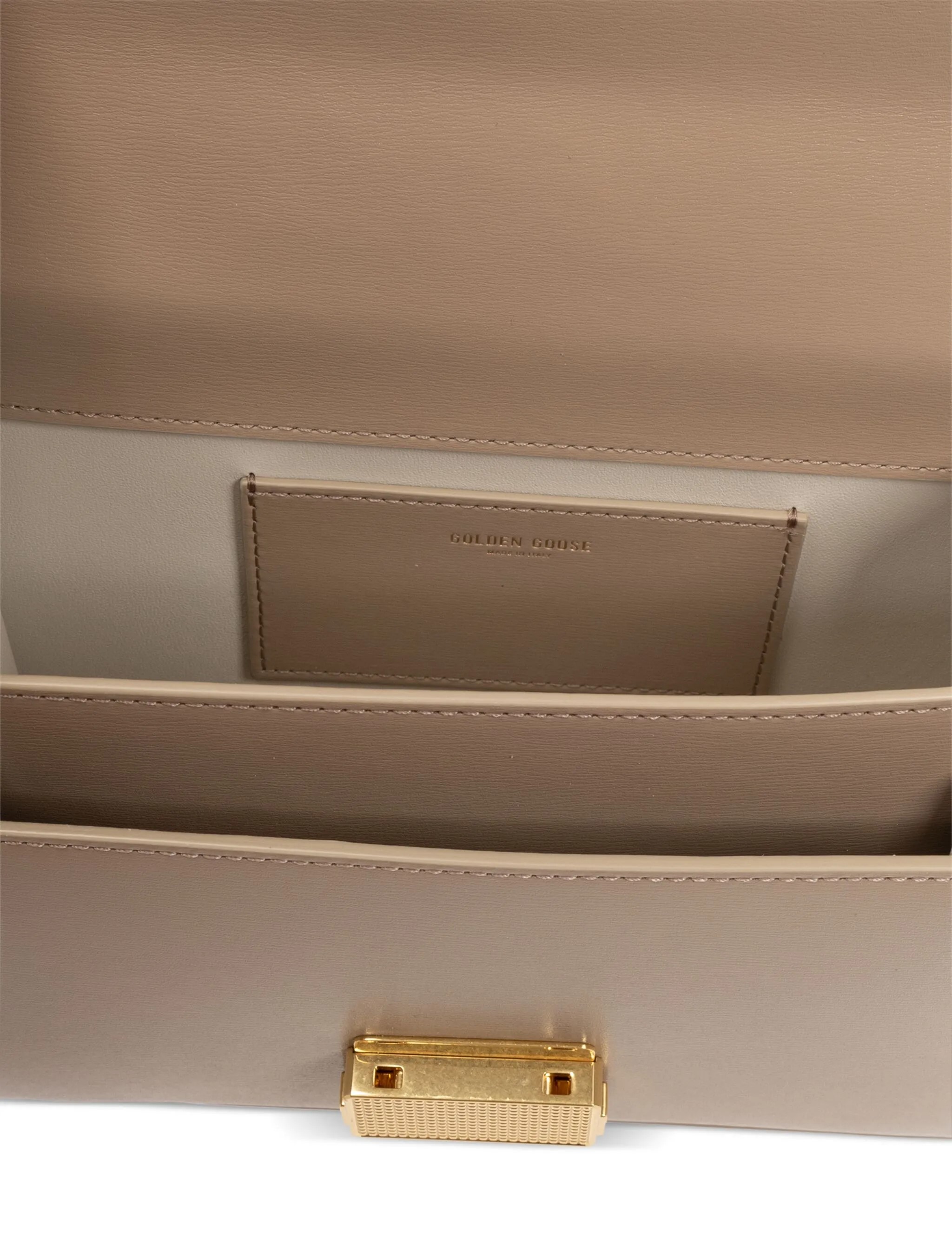 Scomparto unic, logo interno goffrato, tasca interna a soffietto, fodera integrale, dettagli color oro, chiusura frontale con fermaglio.