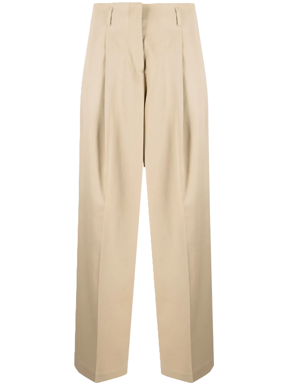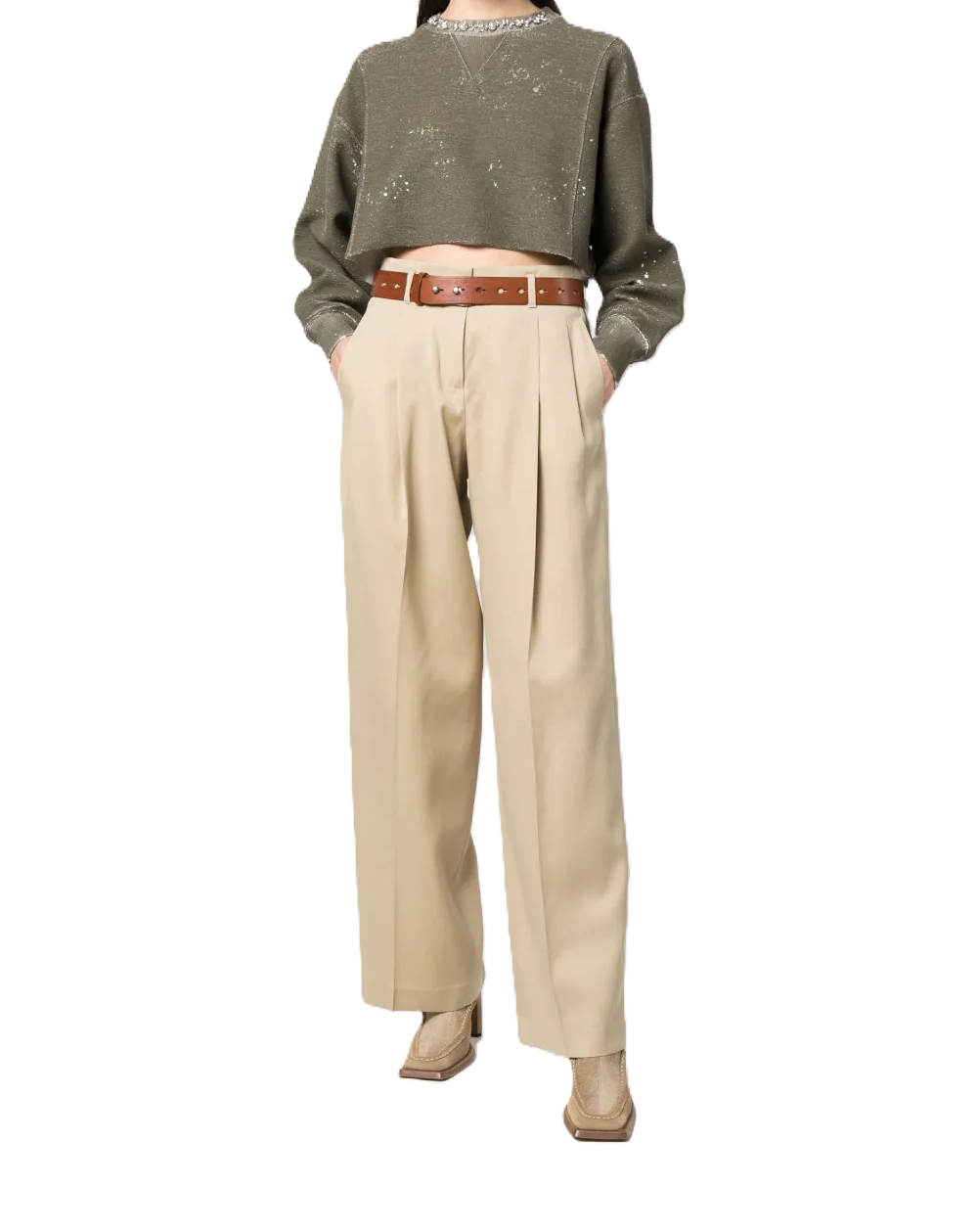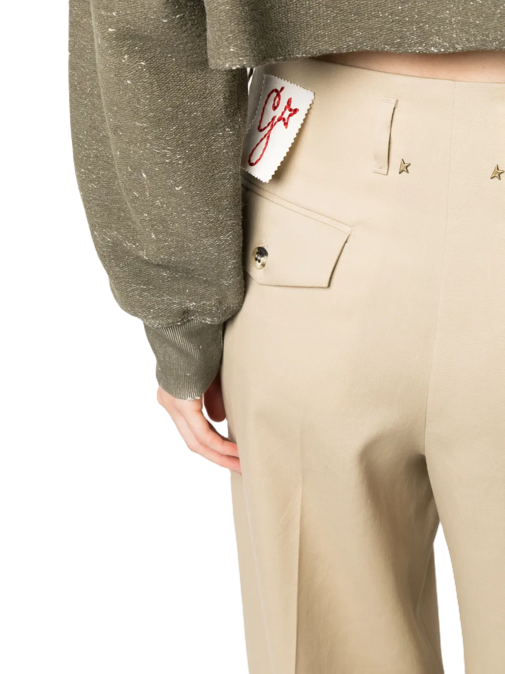 Pantaloni a gamba ampia color sabbia, applicazione posteriore con logo, dettaglio con borchie a stella, piega stirata, vita alta, dettaglio con pieghe a cannone, due tasche posteriori con patte, passanti e gamba ampia.