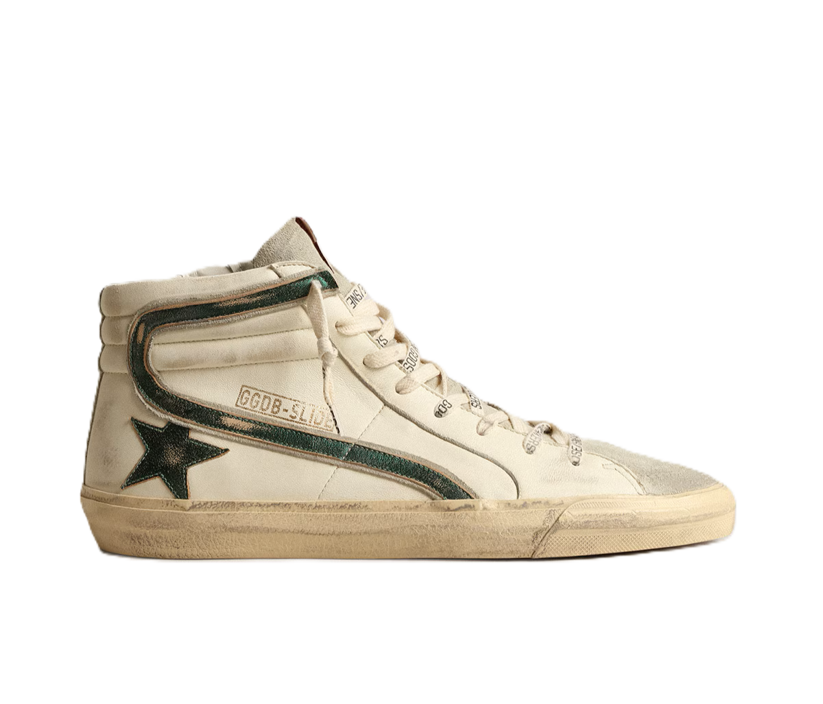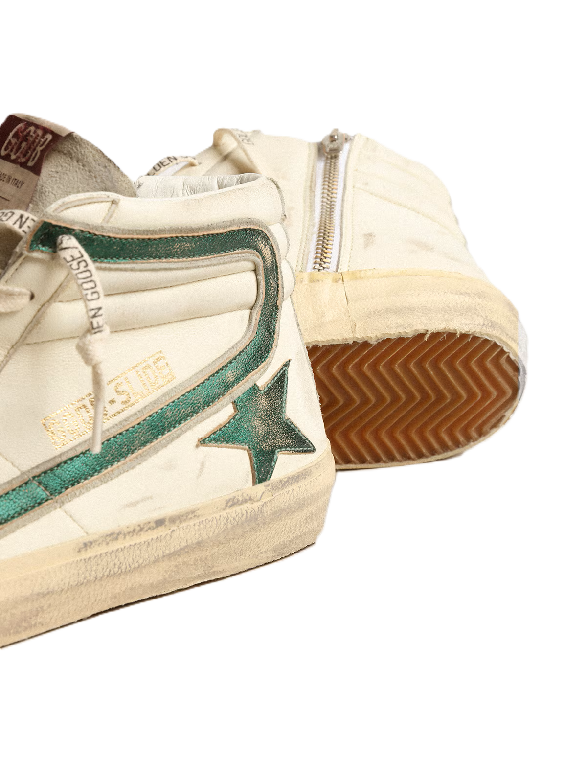 Golden Goose Slide in nappa beige con stella e virgola in pelle laminata verde