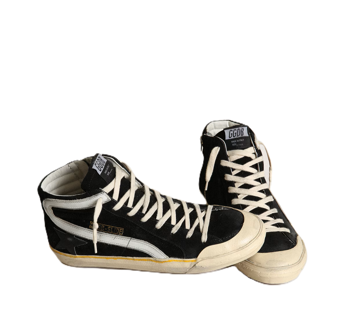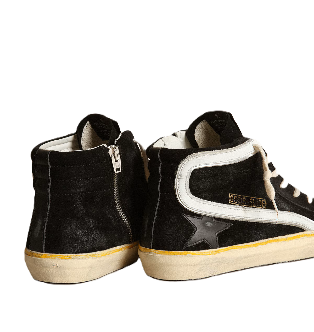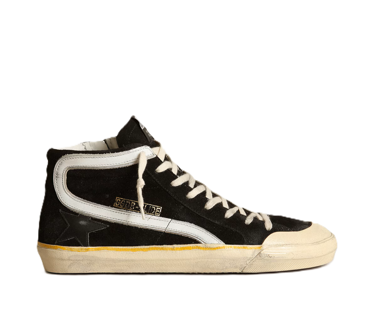 Anima skate, attitude glamour. Le nostre sneaker Slide ti trasportano direttamente a Venice Beach, tra un ollie e un kickflip. Caratterizzato dalla tomaia in suede nero, questo modello si distingue per la stella e il talloncino in pelle nera e per la virgola in pelle bianca. Come tocco finale, la riga gialla sul foxing e i lacci color panna.