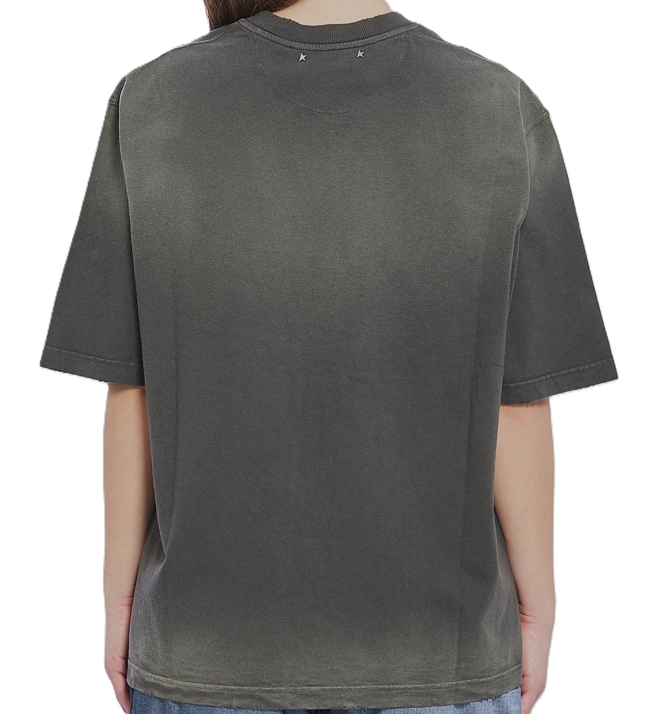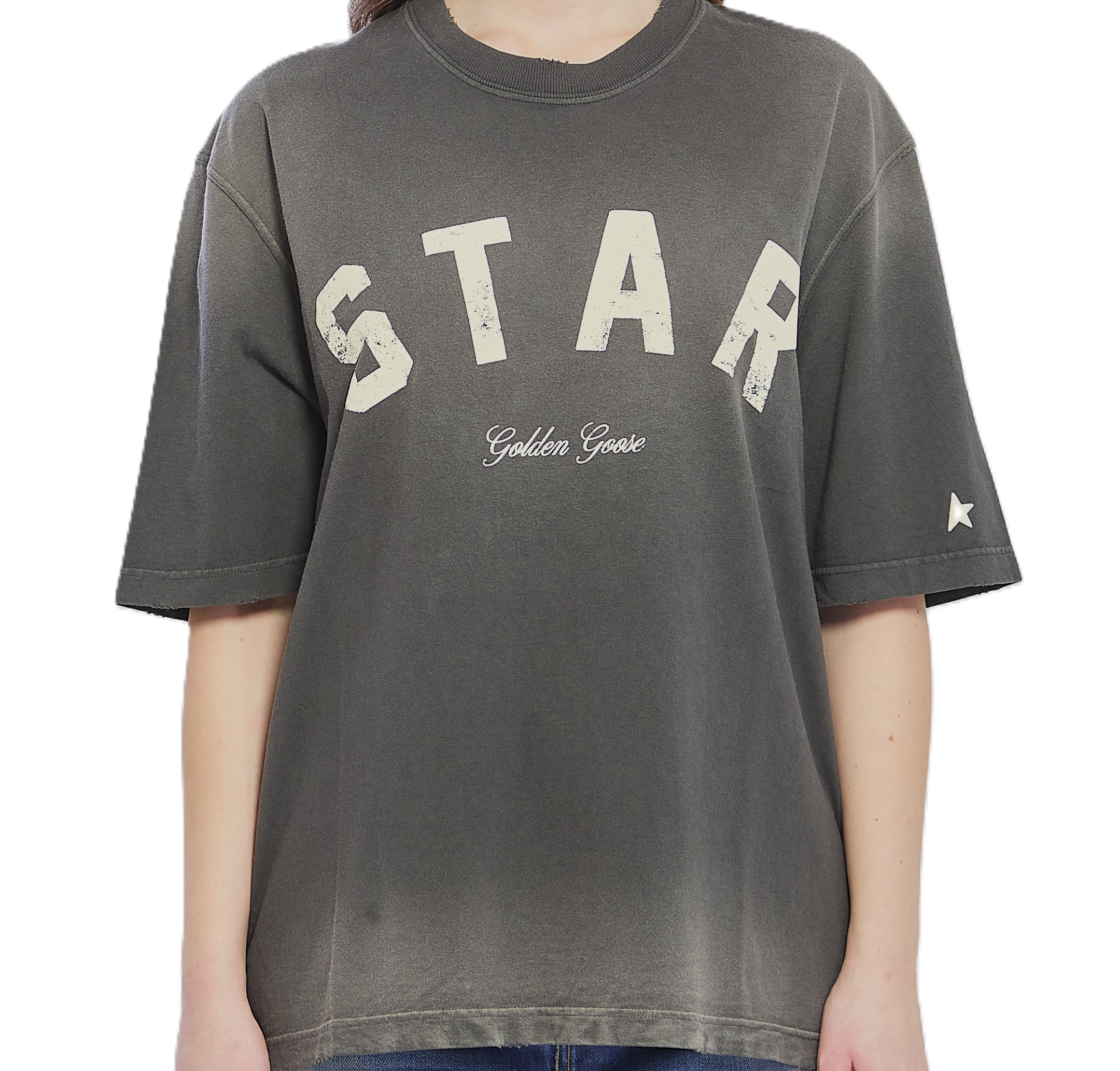 T-shirt in jersey di cotone color carbone, girocollo, maniche corte, ricamo Star Golden Goose sul davanti, stellina applicata sulla manica, doppia stellina applicata sul retro. Trattamento vintage. Vestibilità comoda.