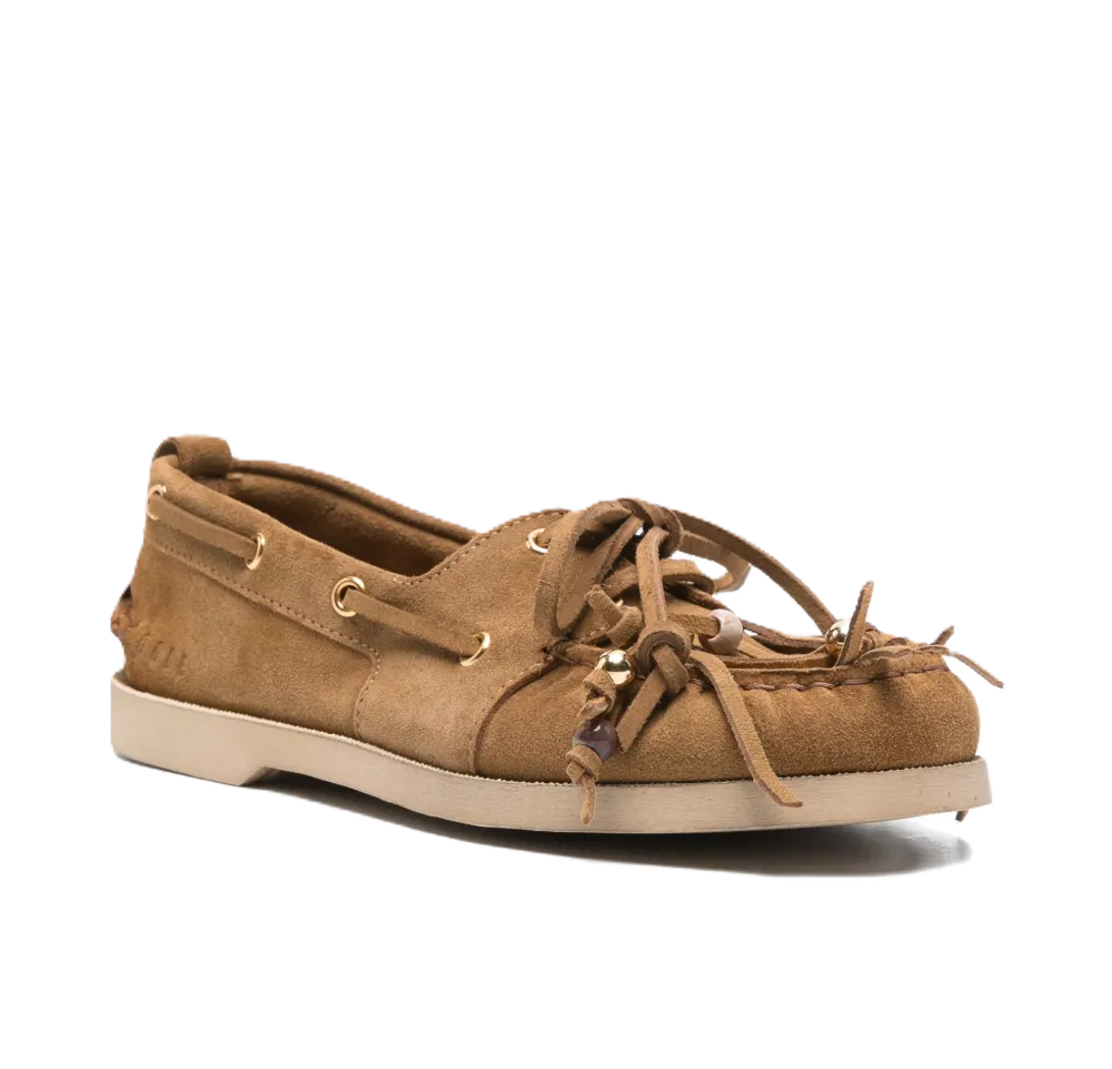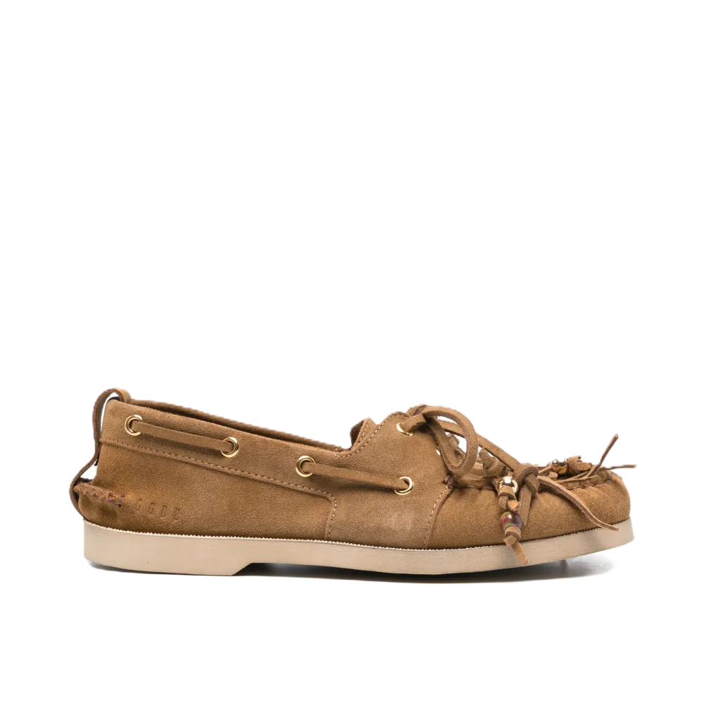 Mocassini Cruise con nappa marrone, dettaglio con occhielli, chiusura con nodo, dettaglio nappina con decorazione con perline