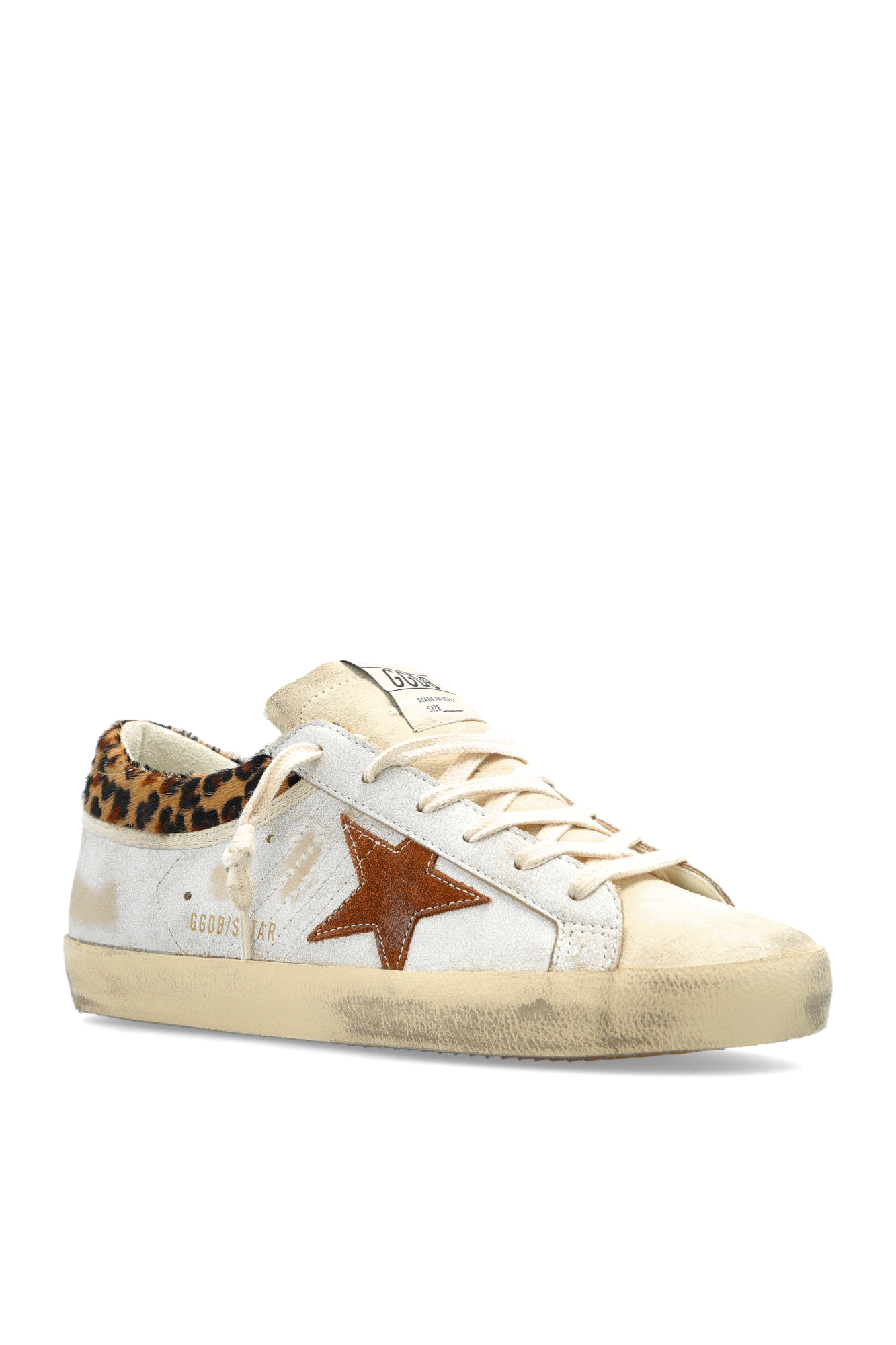 Le sneaker "Super Star With List" presentano una silhouette bassa e senza tempo, che riflette la passione per l'artigianato italiano e un senso dello stile unico. Il bianco dominante della pelle contrasta delicatamente con la grande stella in una tonalità marrone, evocando il prestigioso motivo caratteristico del marchio Golden Goose.