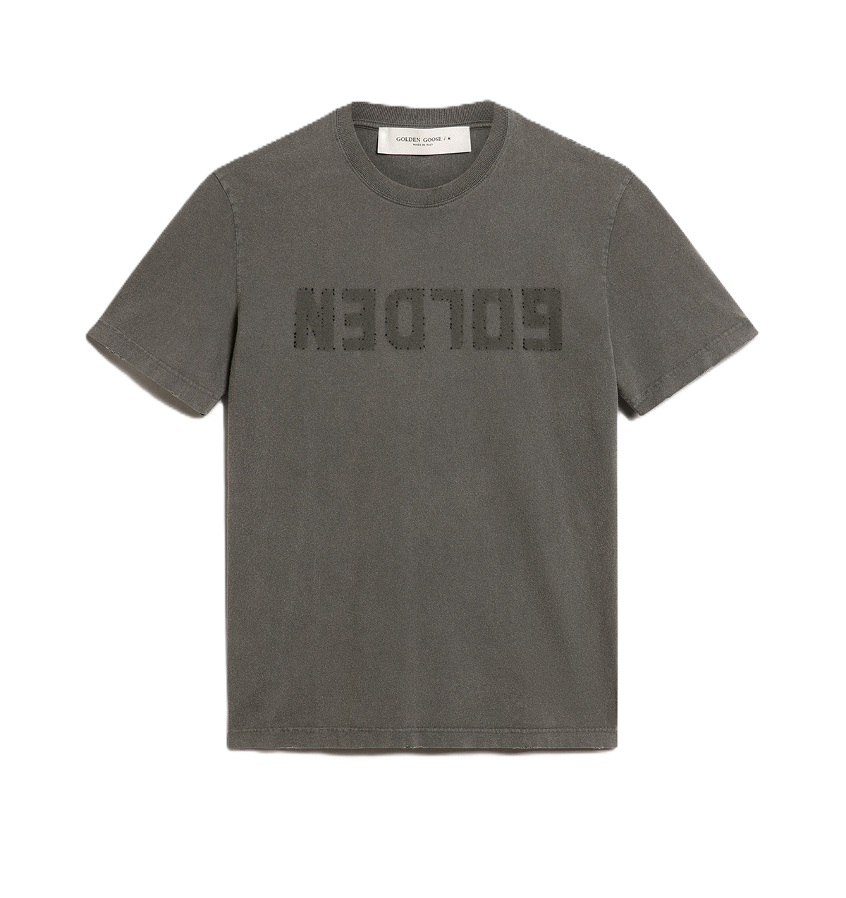T-shirt Distressed di GOLDEN GOOSE grigia in cotone con effetto vissuto, girocollo, stampa e placca con logo.