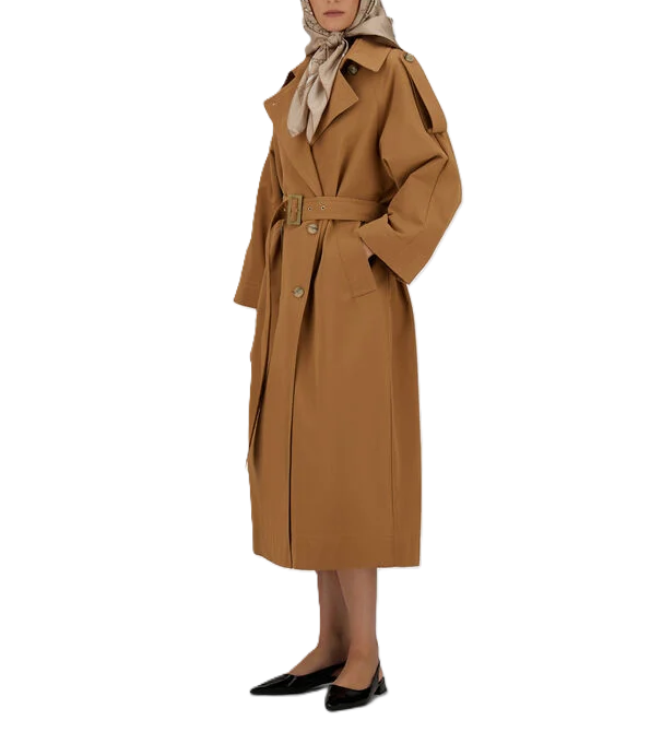 Trench in gabardina di poliestere e cotone intrecciati dall'aspetto tecnico e luminoso. Il tessuto è trattato con un finissaggio antigoccia che fa scivolare l'acqua.