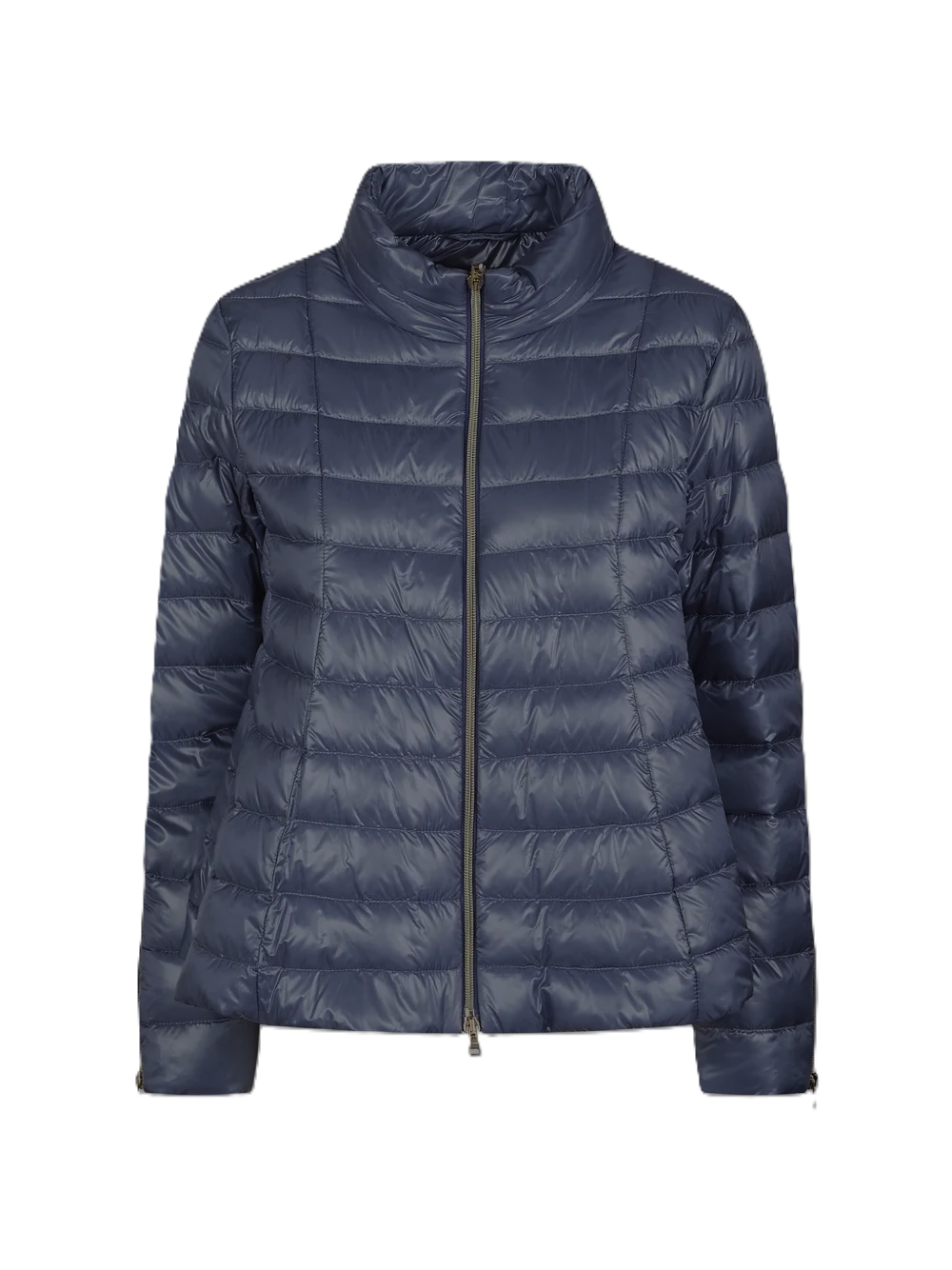 Piumino blu, finitura trapuntata, collo alto, chiusura lampo, maniche lunghe, polsini con cerniera, design imbottito