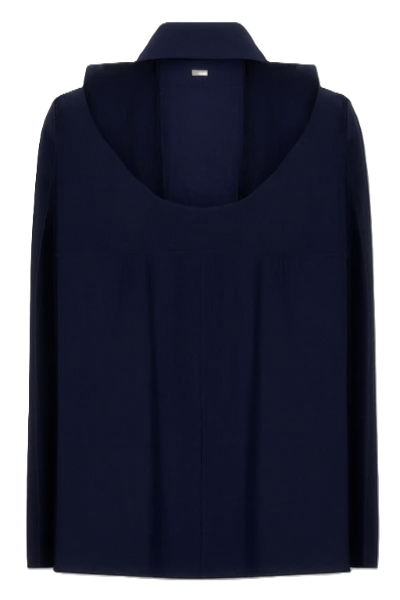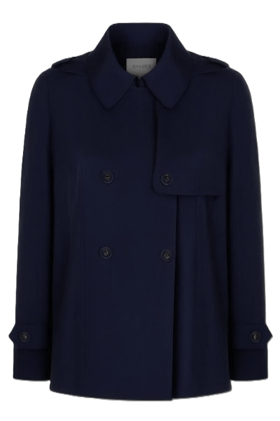Trench corto blu scuro, chiusura con bottoni e gancetto sul colletto
