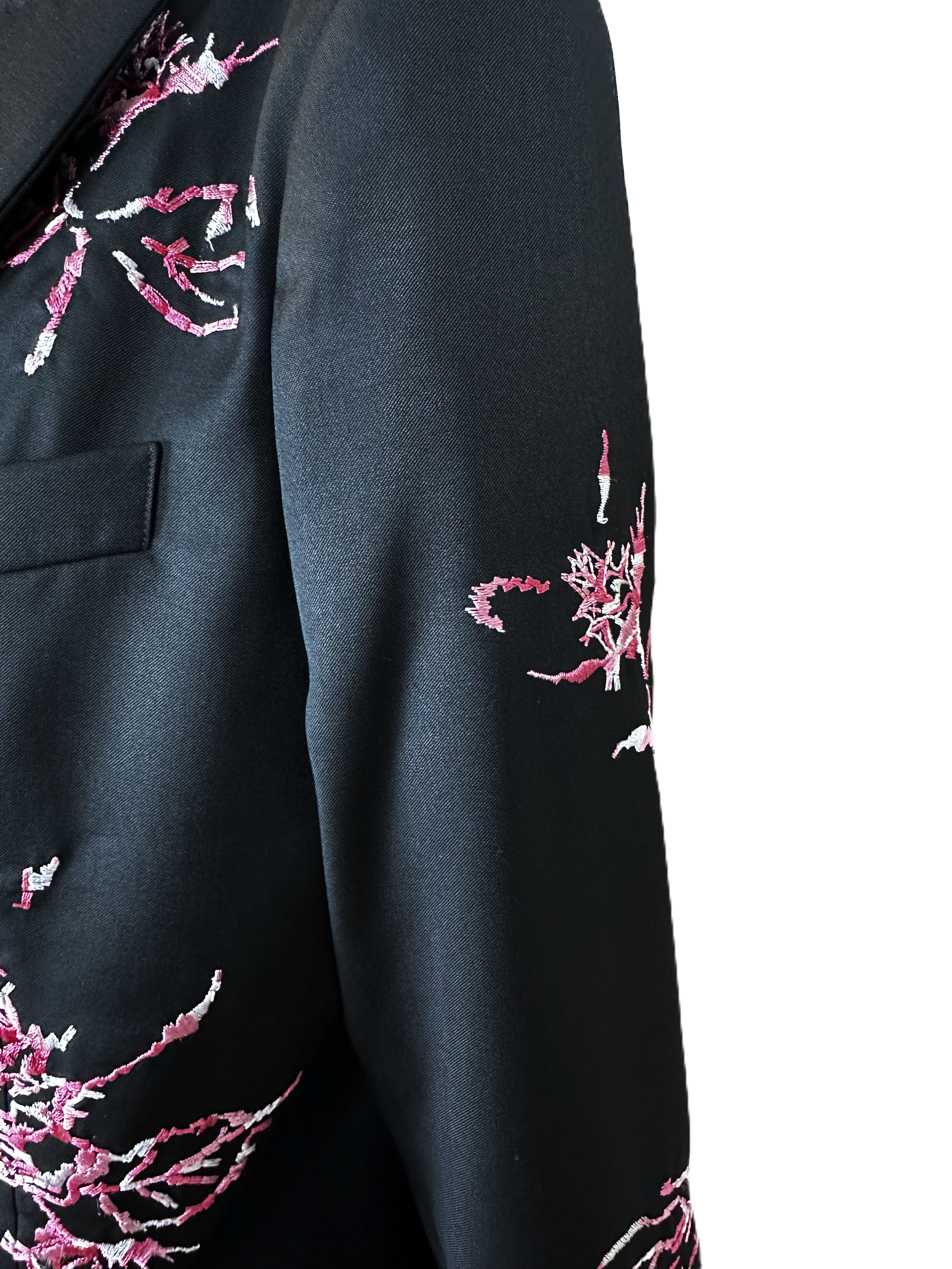 Blazer lungo nero con dettagli floreali ricamati a contrasto nei fantastici toni del rosa fucsia per un tocco di colore!