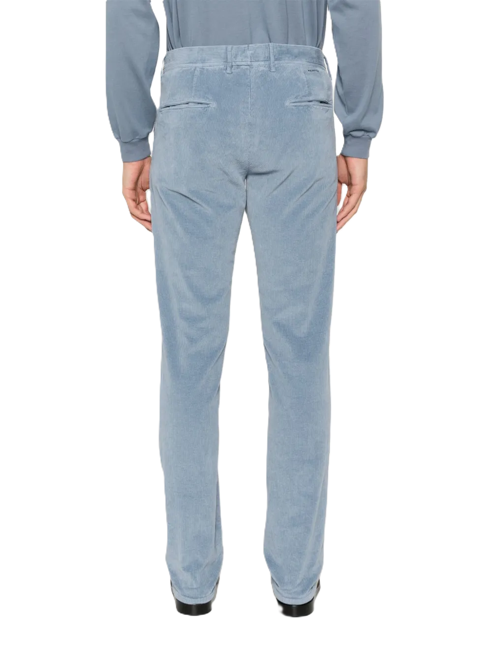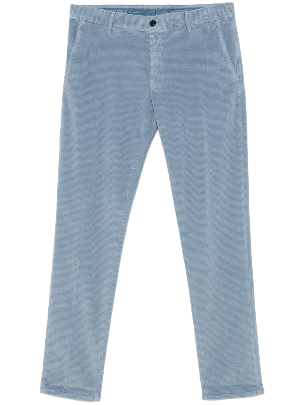 Chino a coste azzurroblu, in cotone elasticizzato, in velluto a coste, chiusura con bottoni, passanti, due tasche laterali a filetto, logo sul retro, due tasche posteriori nascoste, gamba affusolata