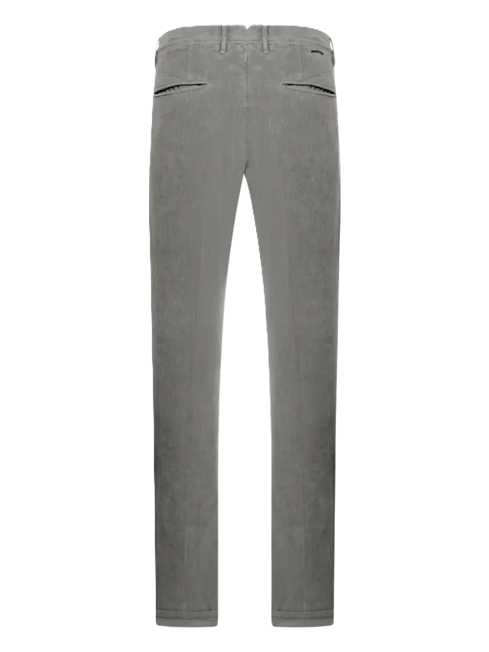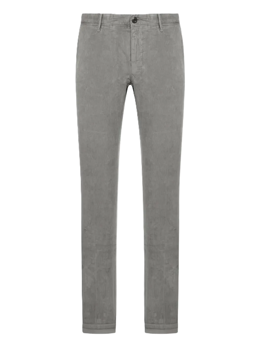 Chino a coste grigi, in cotone elasticizzato, in velluto a coste, chiusura con bottoni, passanti, due tasche laterali a filetto, logo sul retro, due tasche posteriori nascoste, gamba affusolata