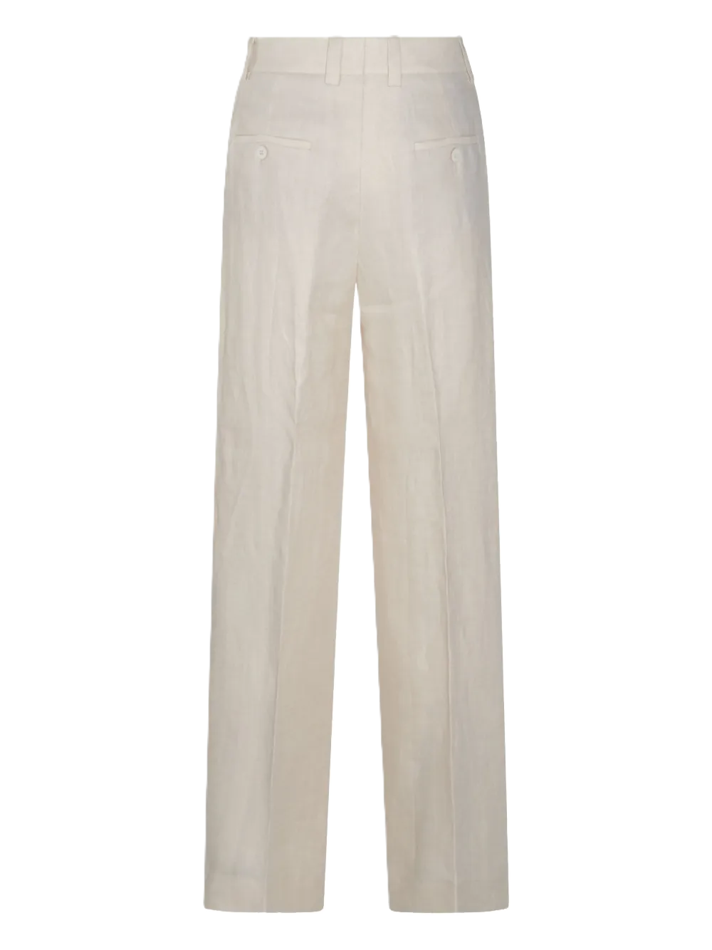 Pantaloni in lino beige, chiusura frontale nascosta, passanti, due tasche laterali a filetto, due tasche posteriori a filetto